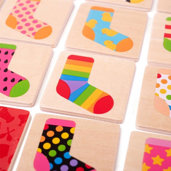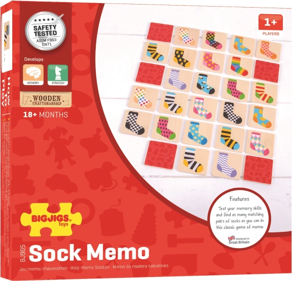 Obohaťte chvíle hier s deťmi pomocou dreveného pexesa s ponožkami. Táto hra stimuluje pamäť a podporuje sústredenie a rozvoj strategických zručností. Všetko, čo potrebujete, je rozložiť 32 drevených hracích dielikov lícom nadol a začať odkrývať dva dieliky súčasne. Obtiažnosť postupne rastie, hráč sa snaží spojiť páry ponožiek a osvojovať si nové stratégie.