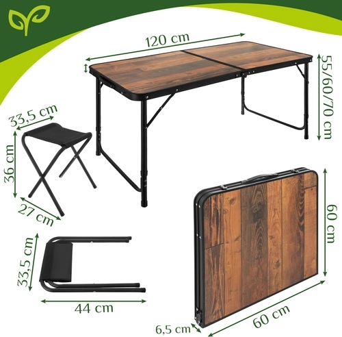 Stôl ponúka 3 úrovne nastavenia výšky, takže ho ľahko prispôsobíte jedlu, kávičke alebo práci v teréne. Štyri ľahké skladacie stoličky zaistia pohodlné sedenie pre 4 osoby a po použití sa zmestia dovnútra zloženého stola pre maximálne úsporné skladovanie aj prevoz.