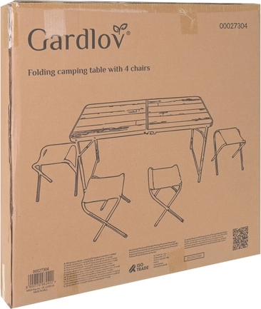 1× skladací stôl (kufrík), 4× skladacia stolička, viacjazyčný návod, prepravný kartón