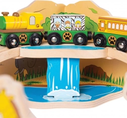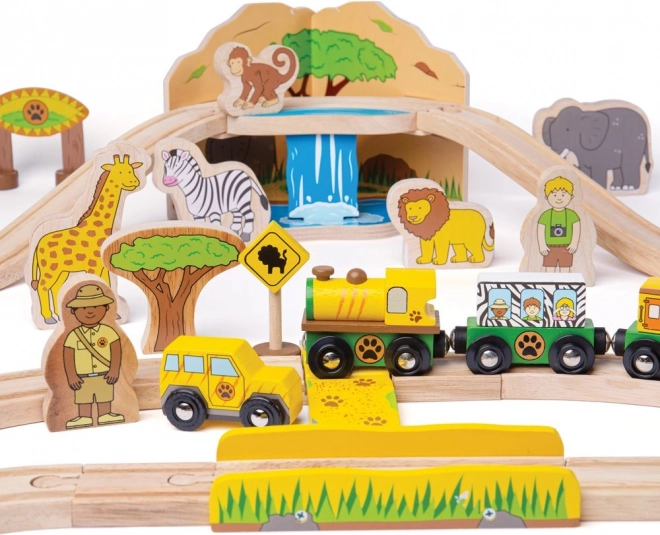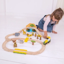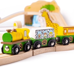 Objavujte svet safari s farebnou a pevnou drevenou vláčkodráhou, ktorá poteší deti od 3 rokov. Set zahŕňa zvieratká ako slon, zebra či opica, stromčeky, značky a most, po ktorom prechádza žltá lokomotíva s dvoma vagónikmi. Vďaka magnetickým spojkám je hra intuitívna a rozšíriteľná.