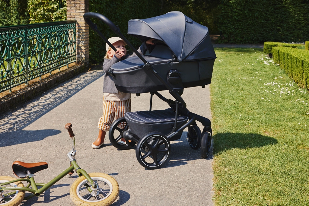 Kočík je pripravený rásť s rodinou – od vaničky či autosedačky až po športové sedenie v smere aj proti smeru jazdy. Možno ho premeniť na duo kočík pre súrodencov či dvojčatá. Konštrukcia sa skladá kompaktne, má výškovo nastaviteľnú rukoväť a uzavretý košík s nosnosťou až 10 kg. Prémiové recyklované tkaniny a koženkové detaily dodávajú kočíku nadčasový vzhľad.