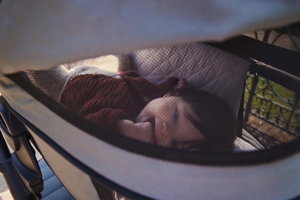 Extra veľká strieška s okienkom a vodeodpudivou úpravou chráni pred slnkom aj dažďom. Zipsové rozšírenie a sieťované panely zlepšujú prúdenie vzduchu.
