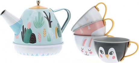 Táto kvalitná kovová čajová súprava poteší všetkých malých hostiteľov a hostiteľky. Vo vnútri konvičky je skrytý naťahovací hudobný strojček, ktorý sa pri naklonení rozoznie príjemnou melódiou a premení každé podávanie čaju na malý ceremoniál. Pastelové farby, milé zvieracie motívy a čisté tvary robia zo súpravy krásny darček aj štýlový doplnok detskej izby.