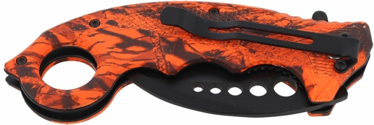 Rukoväť z tvrdeného ABS v červenom camo prevedení dobre padne do ruky a vďaka veľkému prstencu na konci umožňuje istý úchop aj rýchle vytiahnutie z vrecka. Kovová spona uľahčuje nosenie každý deň – či už na taktický tréning, outdoor alebo ako praktický EDC nôž.