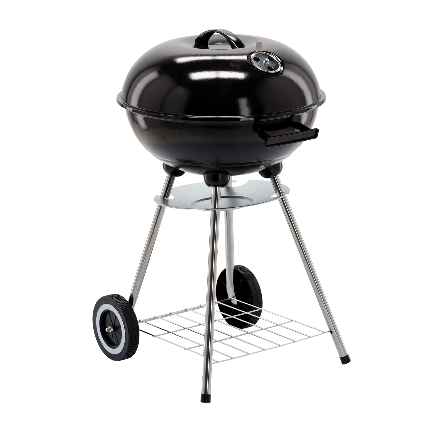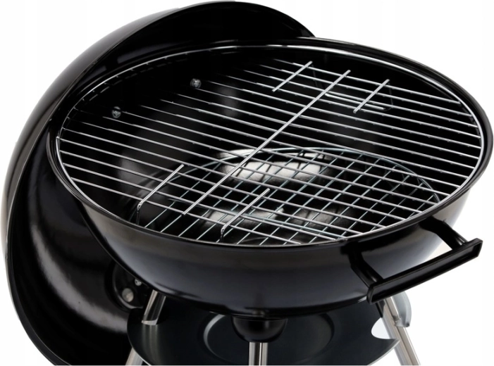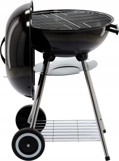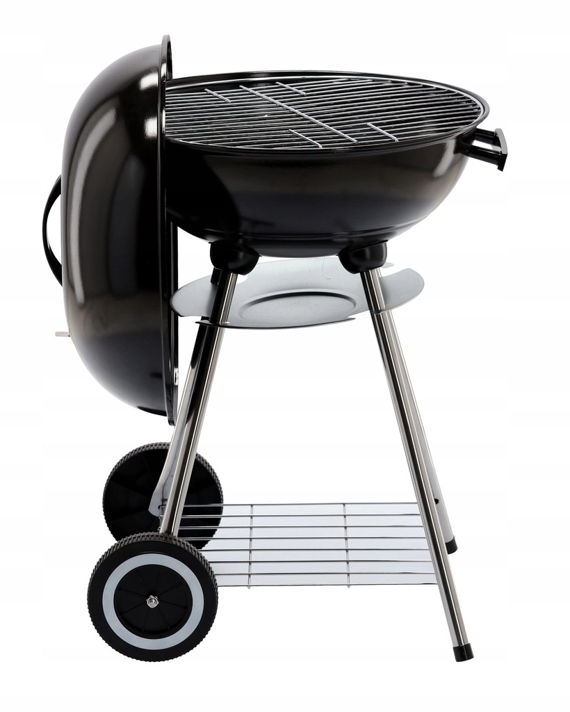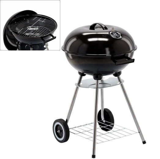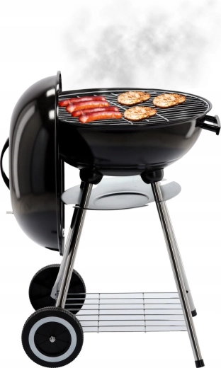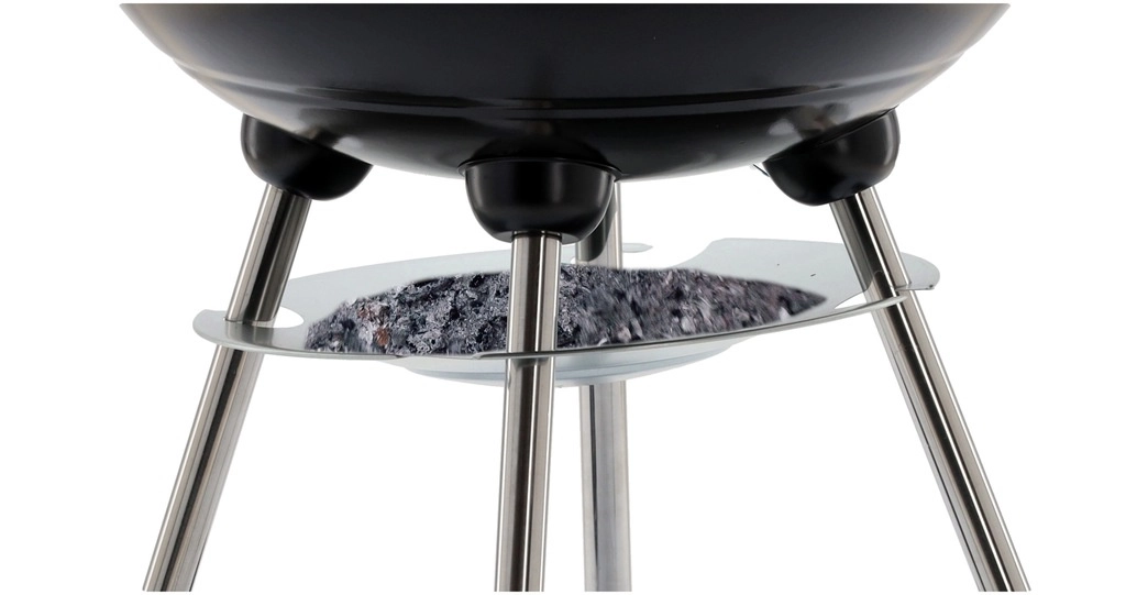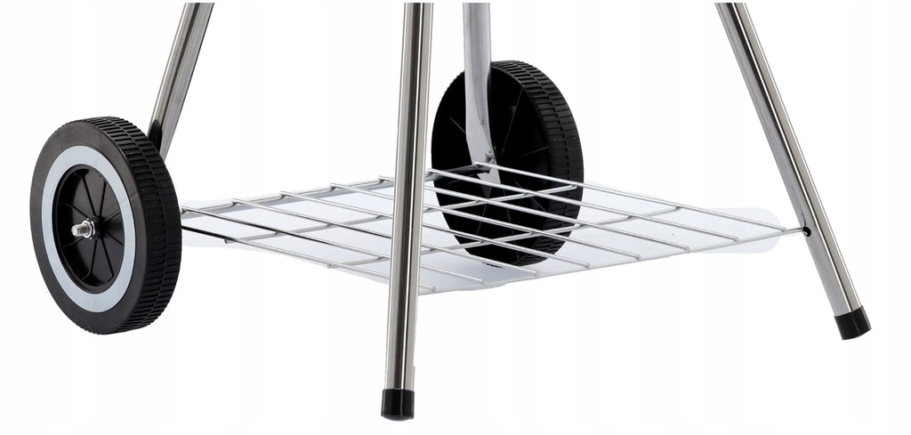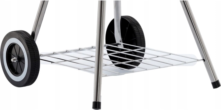 Praktická konštrukcia s dvomi kolieskami umožňuje jednoduché presúvanie, spodná drôtená polica udrží palivo a náradie po ruke a popolník zjednodušuje čistenie po každom grilovaní. Stabilný trojnohý stojan s kovovými nohami dodáva grilu istotu aj na nerovnom povrchu.