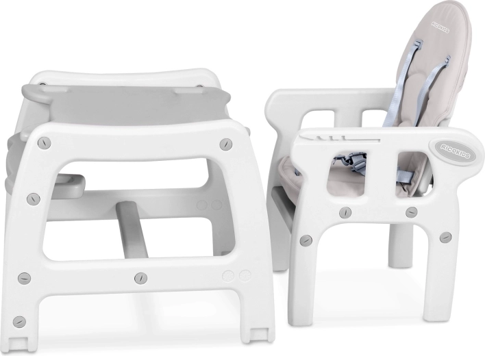 Jedna zostava, päť funkcií: vysoká stolička s pultíkom aj bez neho, nízka stolička, samostatný stolík so stoličkou. Prispôsobí sa každej fáze dňa aj veku dieťaťa.
