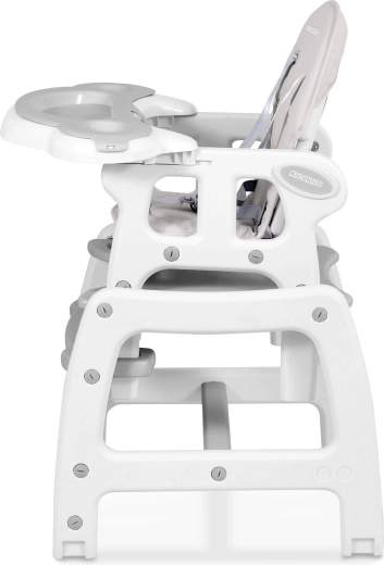 Stolička ponúka 5 praktických konfigurácií: vysoká stolička s pultíkom, vysoká stolička bez pultíka, nízka stolička, samostatná stolička so stolíkom a varianta pre väčšie deti. Trojstupňové nastavenie sklonu operadla zvyšuje komfort, zatiaľ čo dvojitý odnímateľný tácek so zvýšenými okrajmi a otvory na hrnčeky bránia prevrhnutiu nápojov.