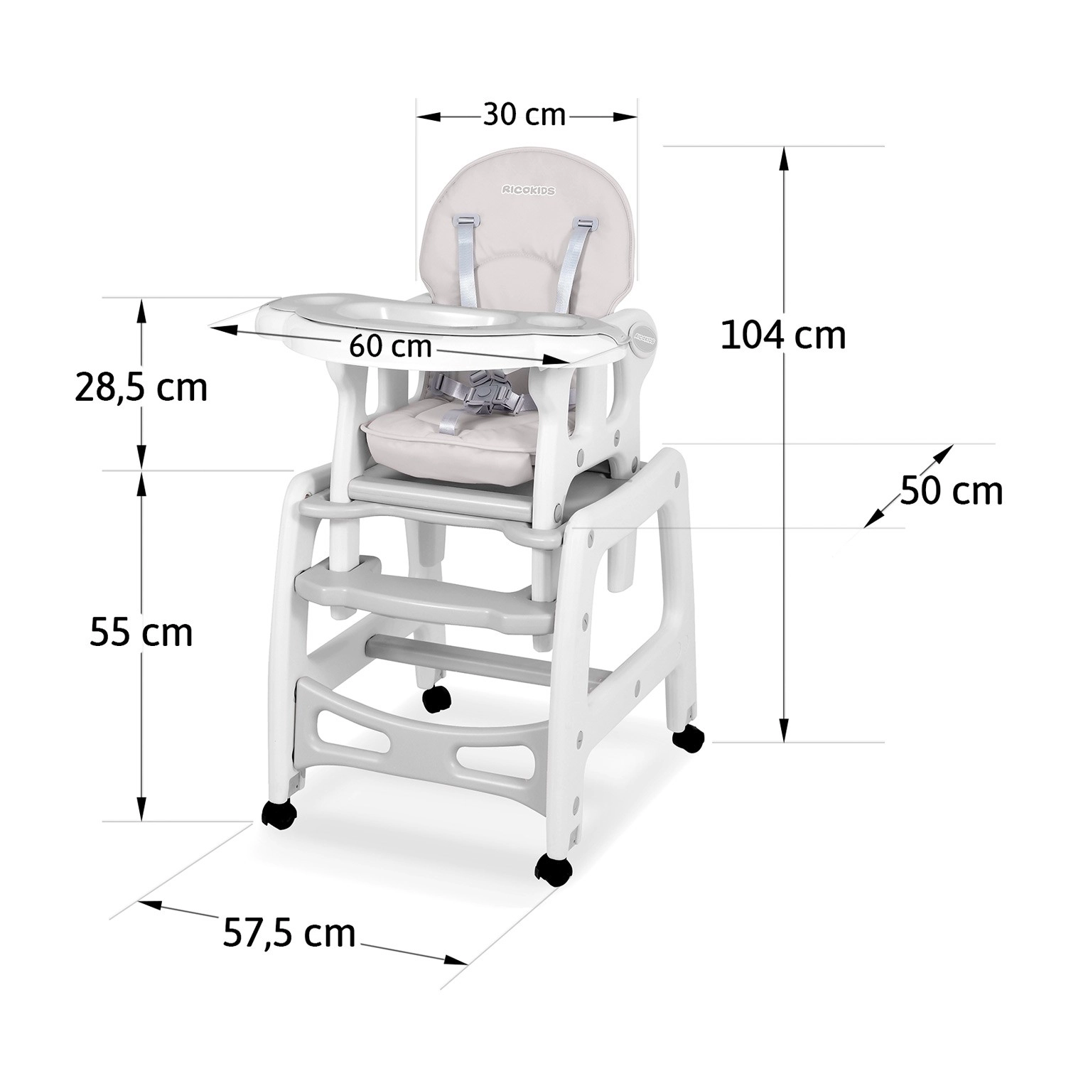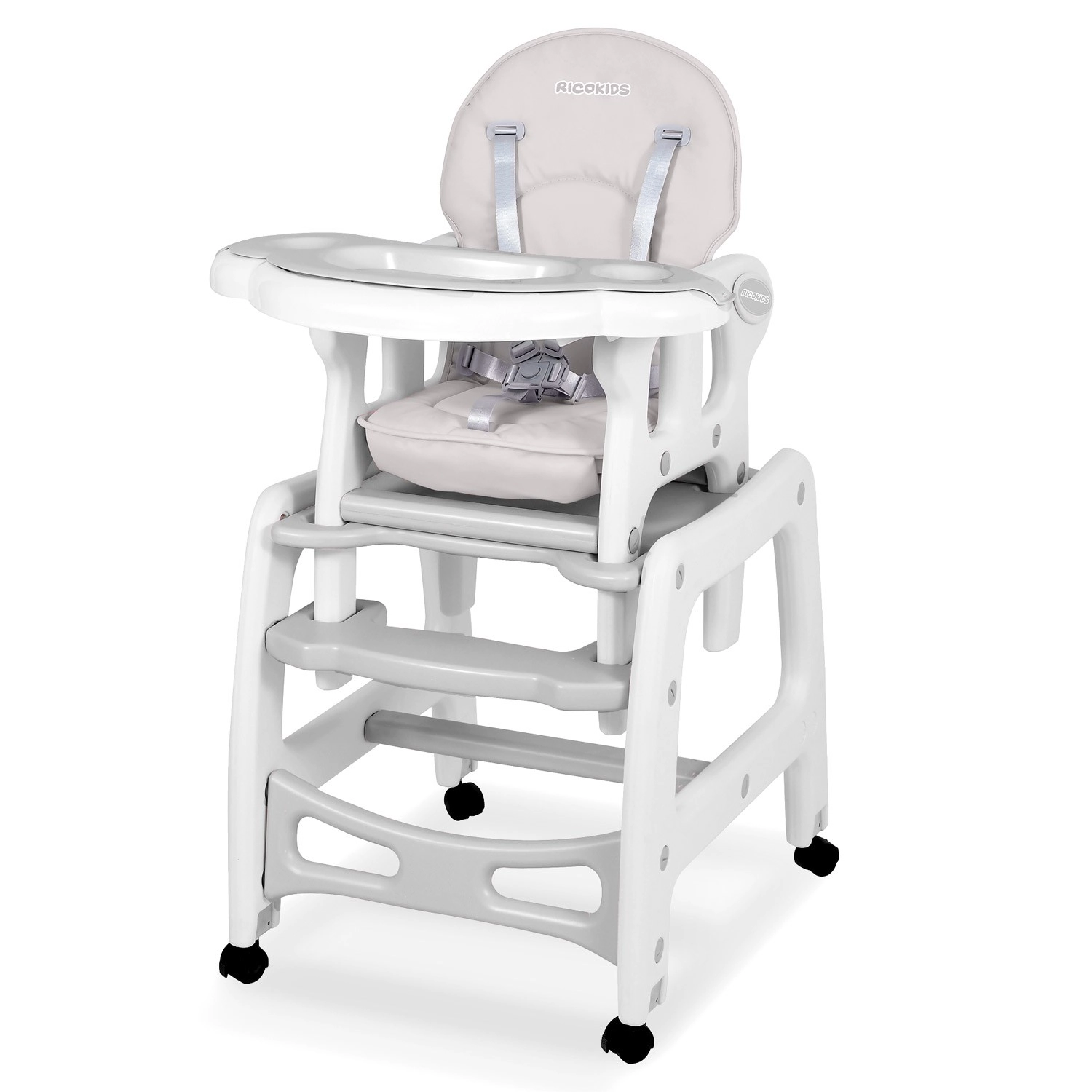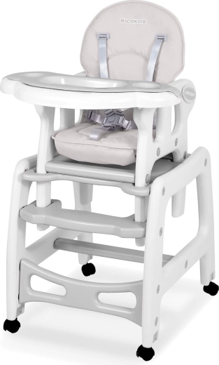 RICOKIDS Sinco je moderná a bezpečná detská jedálenská stolička, ktorá sa prispôsobí každodenným rituálom kŕmenia, hrania aj učenia. Vďaka pevnej konštrukcii, päťbodovým pásom a kolieskam s možnosťou blokácie poskytuje dieťaťu stabilitu a rodičom pohodlie. Mäkké, široké sedadlo s poťahom imitujúcim kožu sa ľahko čistí – nečistoty zotriete handričkou alebo pultík opláchnete pod tečúcou vodou.