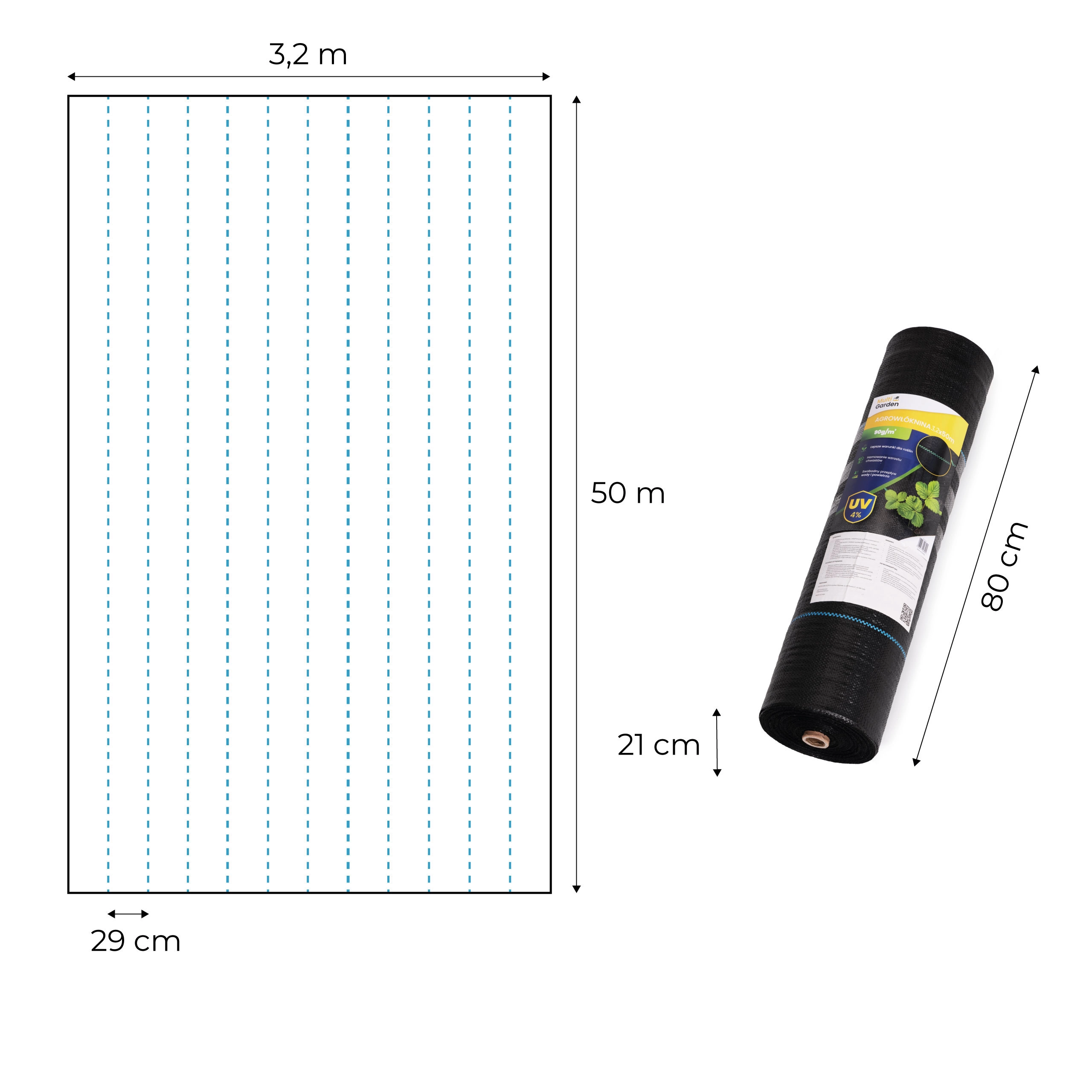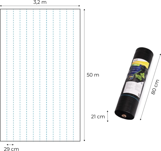 Robustná polypropylénová tkanina s UV stabilizáciou a gramážou 90 g/m² je vhodná na dlhodobé použitie na záhonoch, pod kríkmi, tujami, ovocnými drevinami aj pod mulčom, kôrou či štrkom. Modré vodiace línie po 29 cm urýchlia rozvrhnutie výsadieb a udržia rovné riadky. Priložené spony (50 ks, 15 cm) zabezpečia pevné ukotvenie aj za vetra.