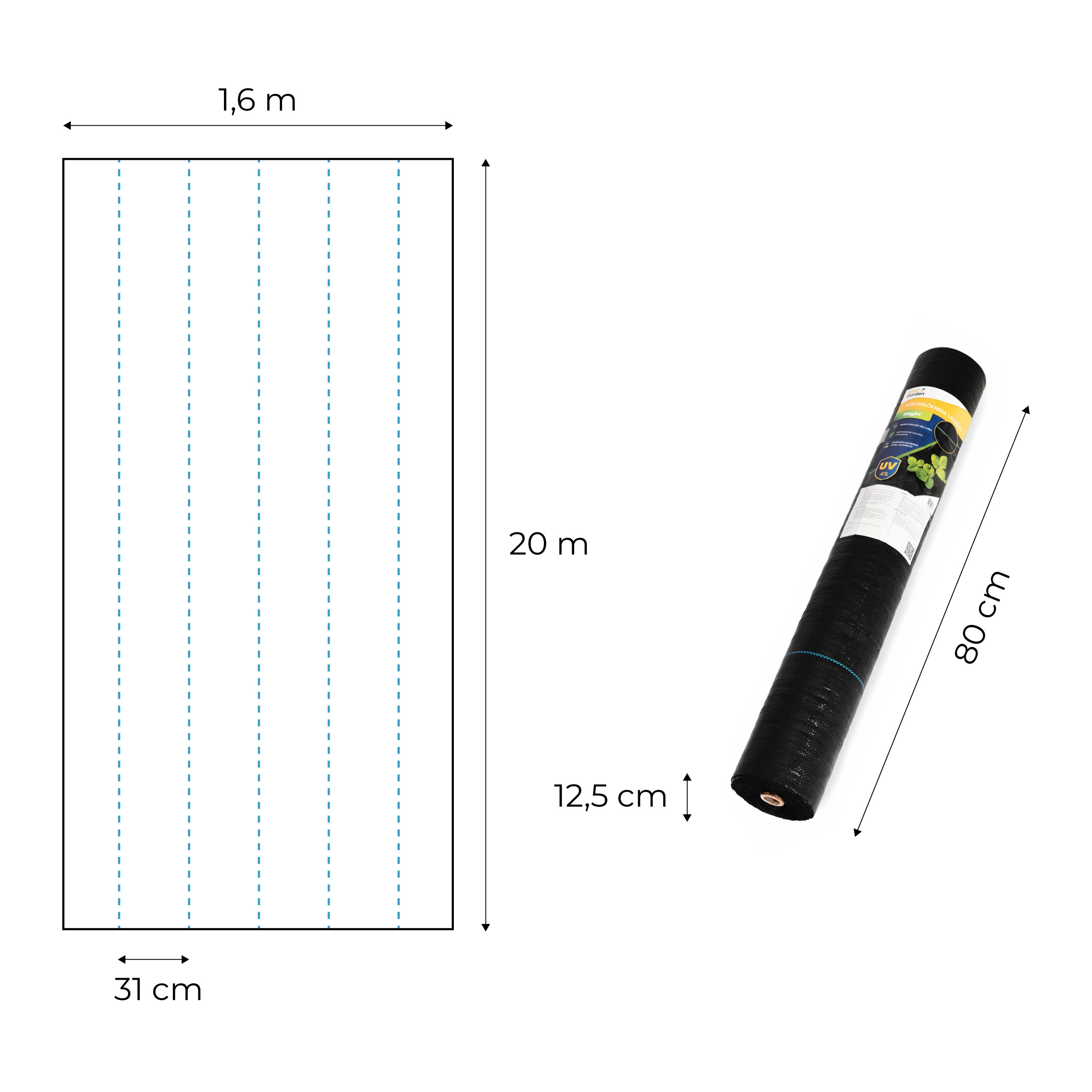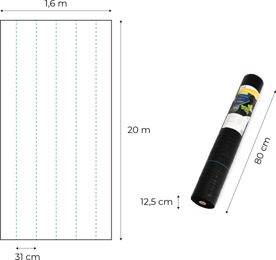 Modré orientačné línie pomáhajú udržať rovné riadky a správne rozstupy (cca 31 cm), čo zrýchľuje prácu pri výsadbe zeleniny, okrasných záhonov aj kríkov. Súčasťou balenia je 50 kolíkov s dĺžkou 10 cm pre pevné zaistenie textílie proti posunu aj vetru.