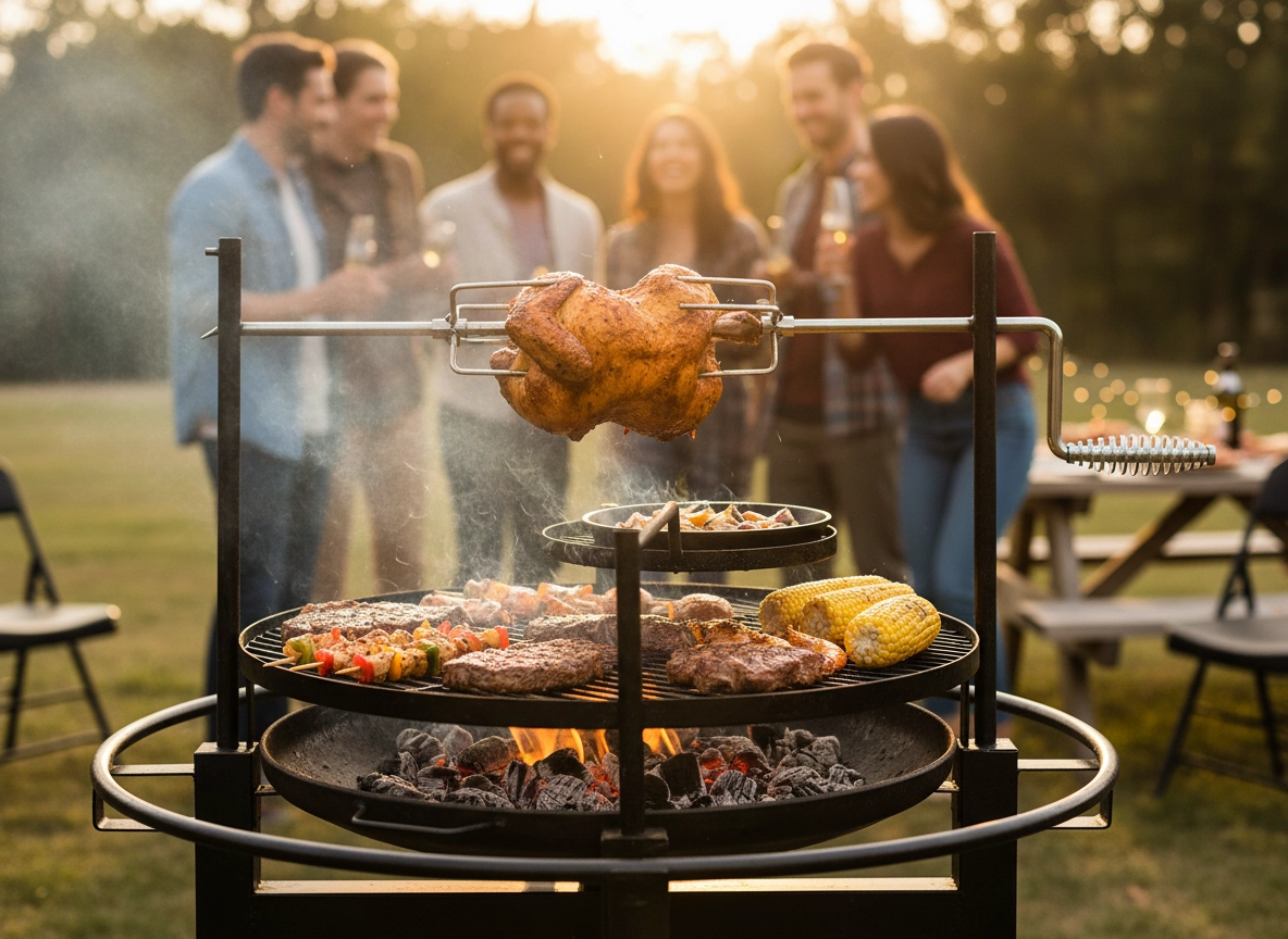 Multifunkčný gril s otočným roštom je ideálnou voľbou pre všetkých milovníkov vonkajšieho varenia. Ponúka veľkorysé rozmery 90 × 86 × 99 cm, stabilné prevedenie a pohodlné používanie, vďaka čomu ľahko pripravíte chrumkavé kurča, šťavnaté steaky aj zeleninu s autentickou arómou.