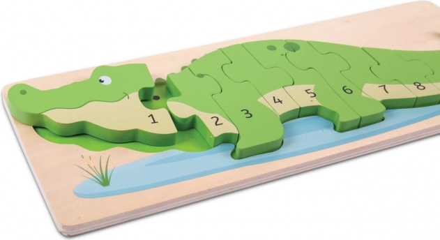 Farebné drevené puzzle v tvare krokodíla učí deti čísla 1–10 hravou formou. 10 pevných dielikov s číslami a bodkovými indikátormi podporuje počítanie, jemnú motoriku, chápanie súvislostí a koncentráciu. Vyrobené z kvalitného dreva, spĺňa európske bezpečnostné normy.