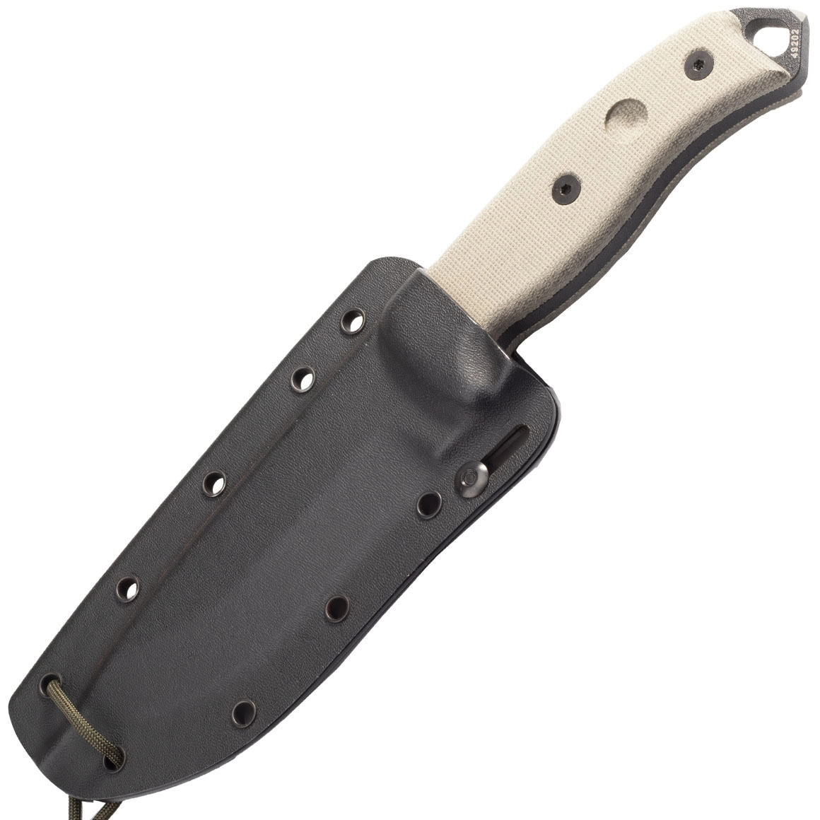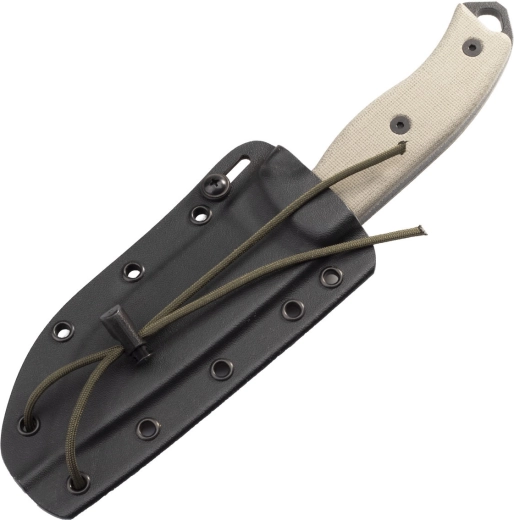 Textúrovaná micarta s jimpingom, úderný tŕň s očkom na šnúru a odolné puzdro Kydex s viacerými možnosťami uchytenia pre pohodlné a bezpečné nosenie.