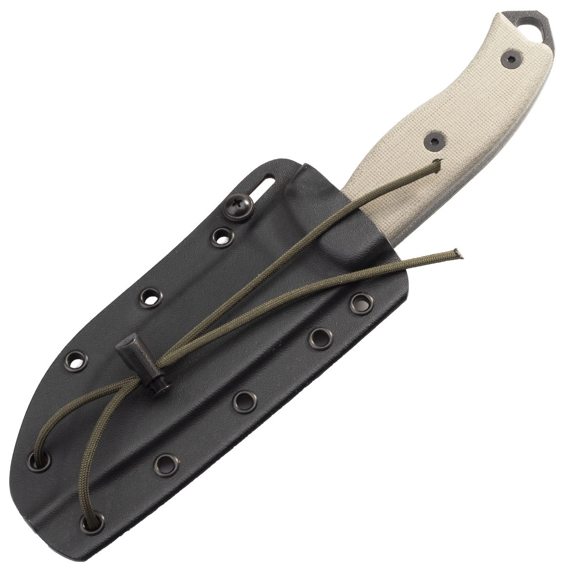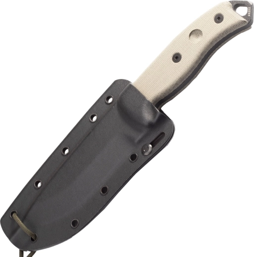 Rukoväť z canvas micarty je skrutkovaná, isto sedí v ruke a ponúka skvelý úchop aj za mokra. Nechýba výrazný jimping opierky pre palec, otvor na šnúru a skleník/úderný tŕň na konci. Zaujímavosťou je integrovaná jamka pre bow‑drill na zakladanie ohňa. Nôž dopĺňa odolné puzdro Kydex s viacnásobnými priechodkami pre variabilné nosenie.