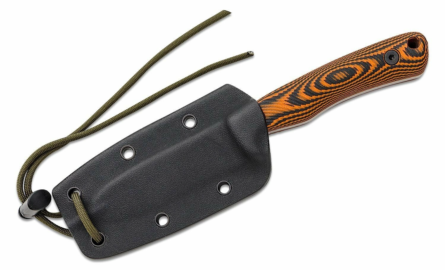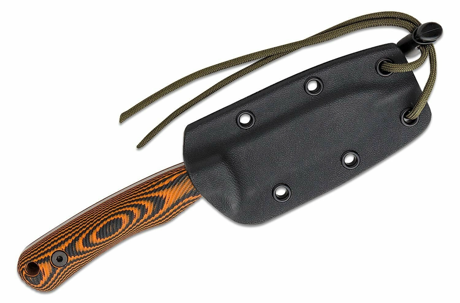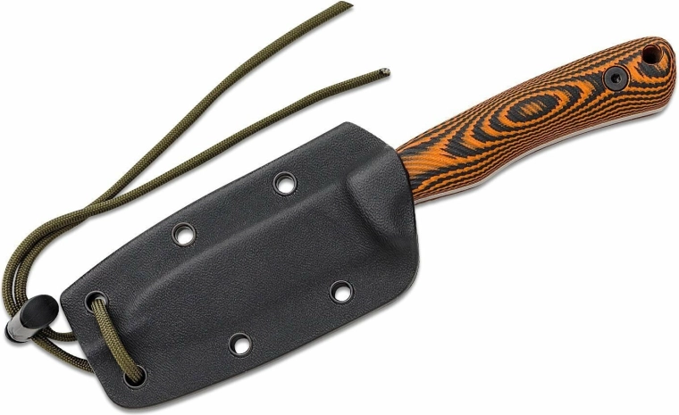 Plná tang konštrukcia a výrazná záštita chránia ruku pred skĺznutím na ostrie. Textúrované črienky z G10 v čierno‑oranžovej kombinácii poskytujú istý úchop vo vlhkom aj chladnom prostredí. Vďaka otvoru na šnúrku možno nôž poistit alebo ľahko vyťahovať z pošvy.