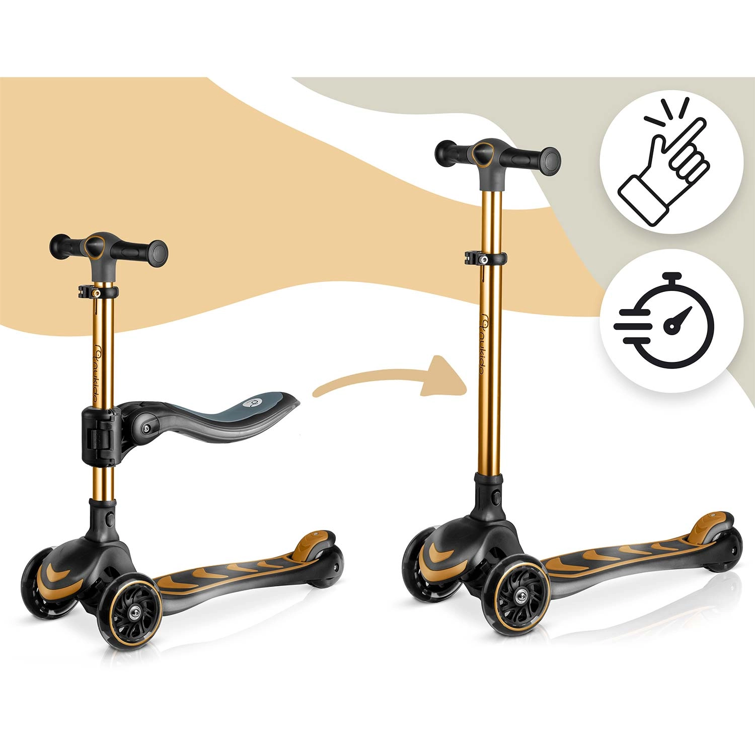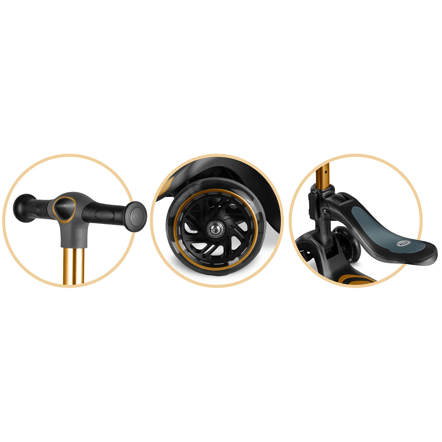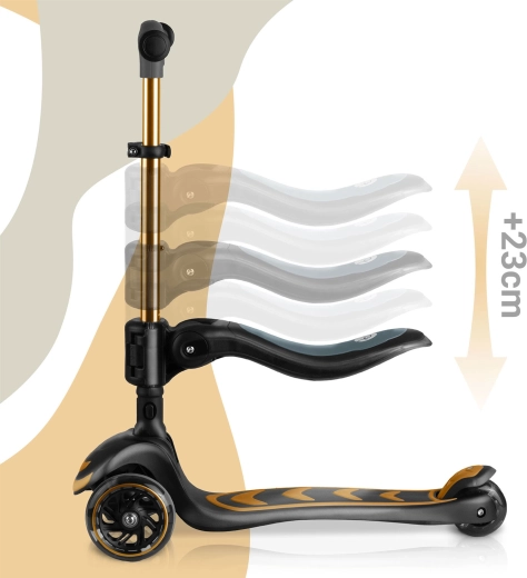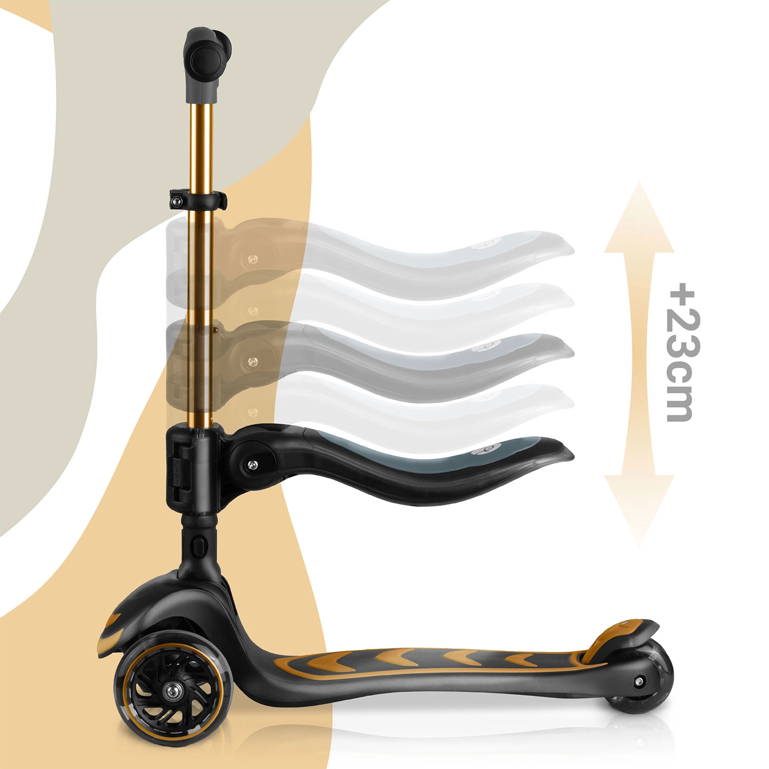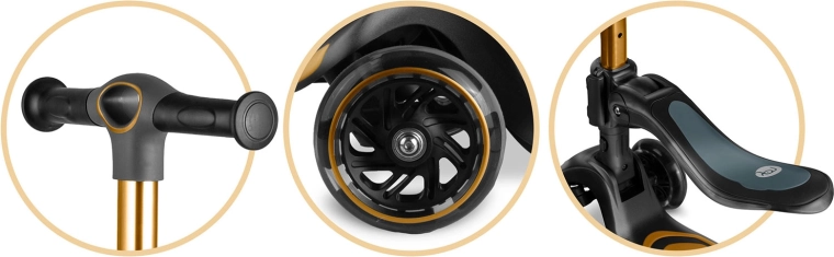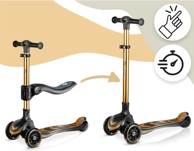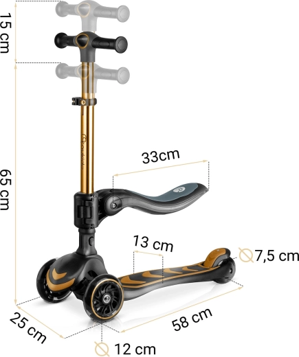 T-bar s nastaviteľnou výškou a odnímateľné sedadlo s 3-stupňovou reguláciou umožnia prechod od odrážadla ku kolobežke. Jedna hračka na mnoho rokov radosti.