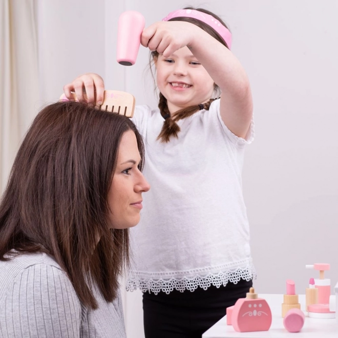 Roztomilá 11-dielna drevená sada pre hru na salón krásy v praktickom prenosnom kufríku poteší všetky malé parádnice od 3 rokov. Deti si užijú napodobňovanie dospelých s doplnkami ako zrkadielko, hrebeň, fén, rúž či lak na nechty – a zároveň rozvíjajú kreativitu a jemnú motoriku aj sociálne a jazykové zručnosti. Vyrobené z kvalitných a bezpečných materiálov, spĺňa európske normy.