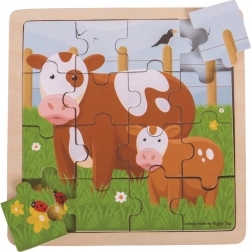 Starostlivá kravička so svojím teliatkom pozýva deti na zelenú lúku – čaká ich pohodové skladanie, ktoré podporuje jemnú motoriku a trpezlivosť. Dieliky sú pevné, hladko opracované a prispôsobené malým rúčkam, takže sa s nimi dobre manipuluje. Vďaka formátu 18 × 18 × 1 cm sa puzzle hodí domov aj na cesty.