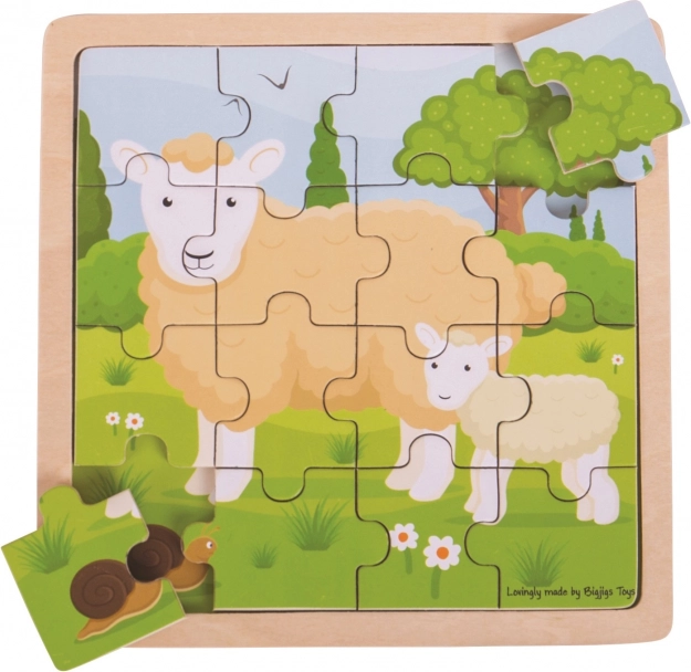Toto drevené rámové puzzle BIGJIGS TOYS prináša nežný motív ovečky s jahniatkom, ktorý deti nadchne na prvý pohľad. Dieliky sa skladajú priamo do rámu na podklad s rovnakým motívom, takže sa obrázok neposúva a deti ľahko vidia, kam ktorý dielik patrí.