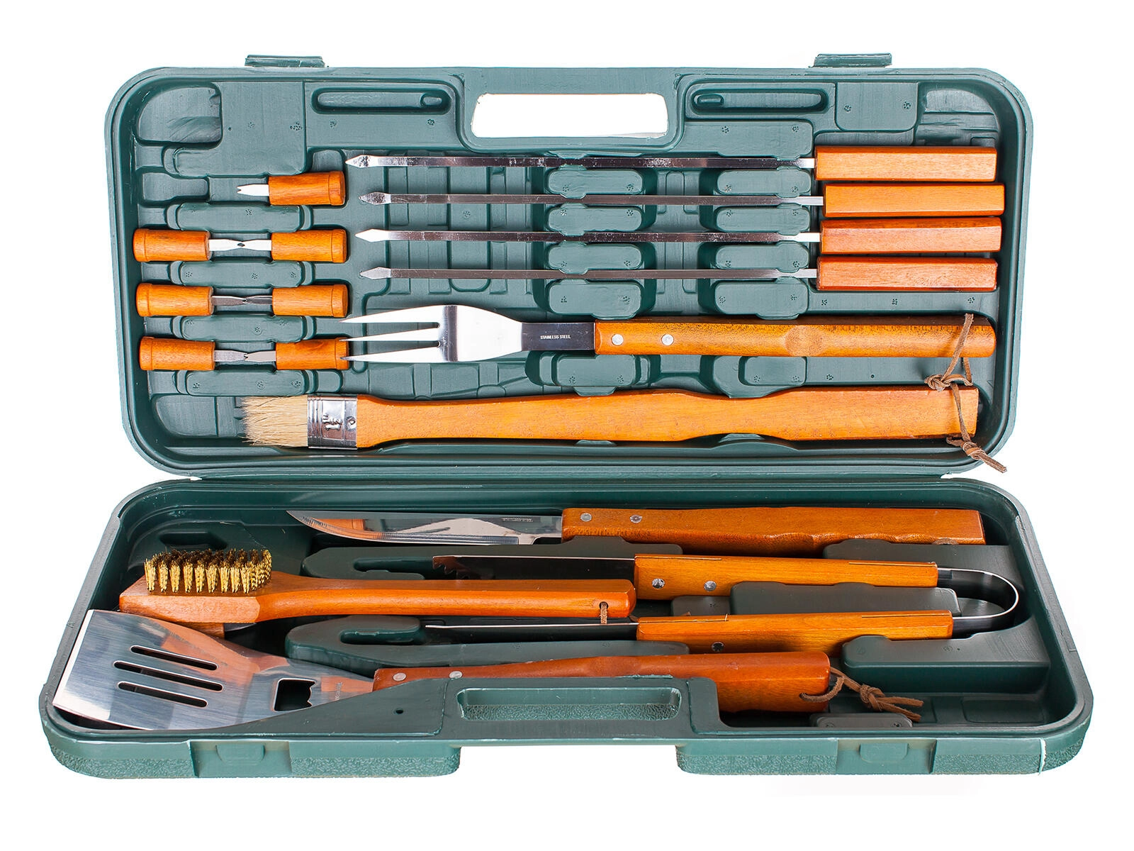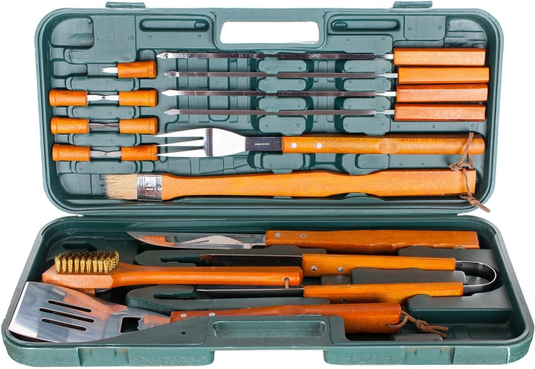 Táto univerzálna 18-dielna súprava grilovacieho náradia ponúka všetko od obracačky a klieští až po ihlice a napichovátka. Nástroje z kvalitnej nerezovej ocele s dlhými drevenými rukoväťami zabezpečujú bezpečný úchop a pohodlie pri práci nad žiarom. Všetko vybavenie je prehľadne uložené v odolnom plastovom kufri, ktorý uľahčuje prenášanie aj skladovanie.