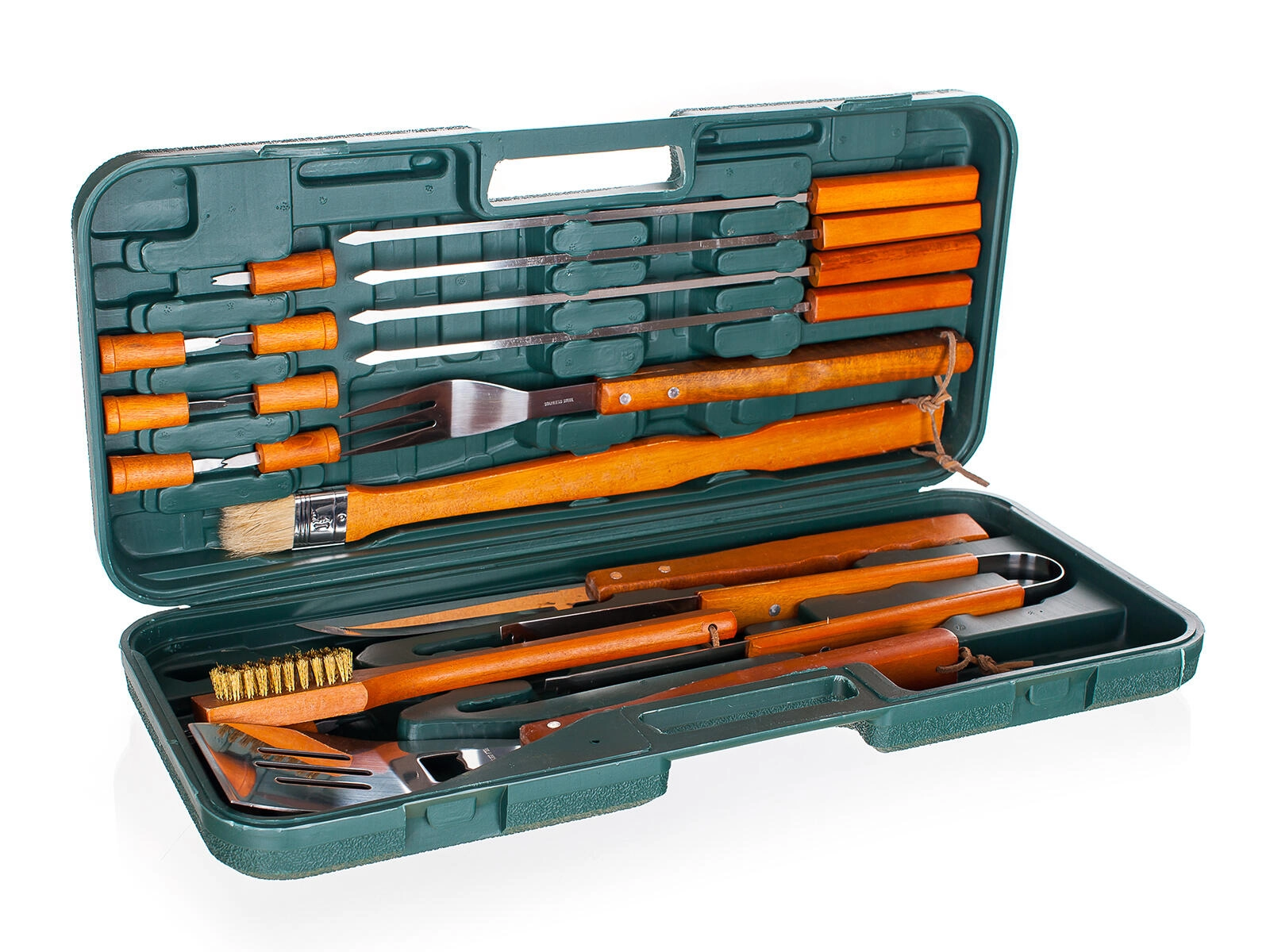 - Čistiaca drôtená kefka 29 cm; kliešte 34 cm; obracačka 41 cm; porcovací nôž 44 cm; vidlička s 3 hrotmi 40,5 cm; 4× grilovacia ihlica 40,5 cm; 8× napichovátko 6,5 cm; štetec 46 cm