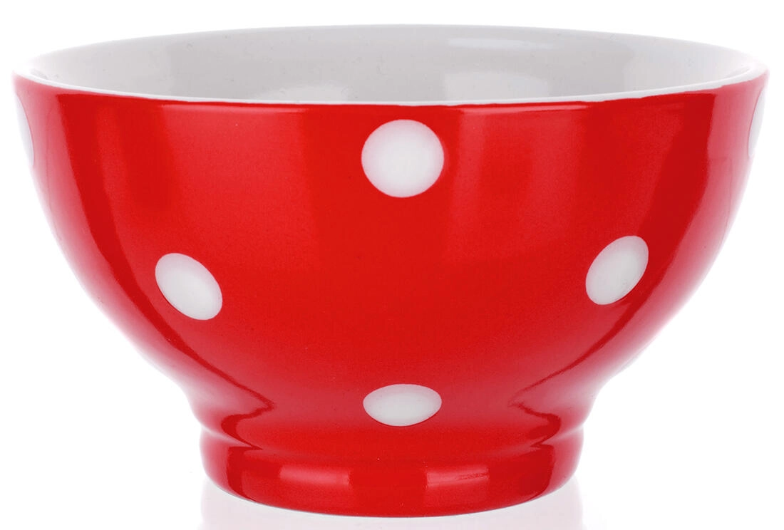 Štýlová červená miska s bielymi bodkami je ideálna na každodenné servírovanie raňajok, polievok či dezertov. Je vyrobená z odolnej keramiky, možno ju bez obáv používať v mikrovlnnej rúre a umývať v umývačke riadu. Kompaktné rozmery priemer 13 cm a výška 7,2 cm z nej robia praktický doplnok do každej kuchyne.