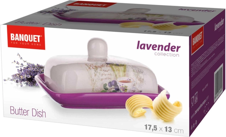 Elegantná keramická maslenka Lavender je ideálna na každodenné stolovanie aj slávnostné chvíle. Kvalitná glazúra v kombinácii fialovej a bielej farby chráni povrch, uľahčuje čistenie a zvýrazňuje romantický dekor levandule.