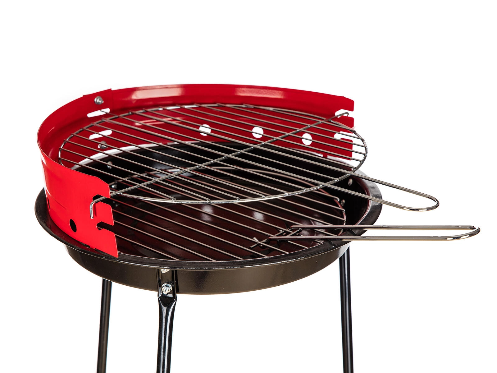 Dva chrómované rošty a červená veterná zástena pomáhajú s rovnomerným grilovaním a ochranou pred poryvmi vetra.