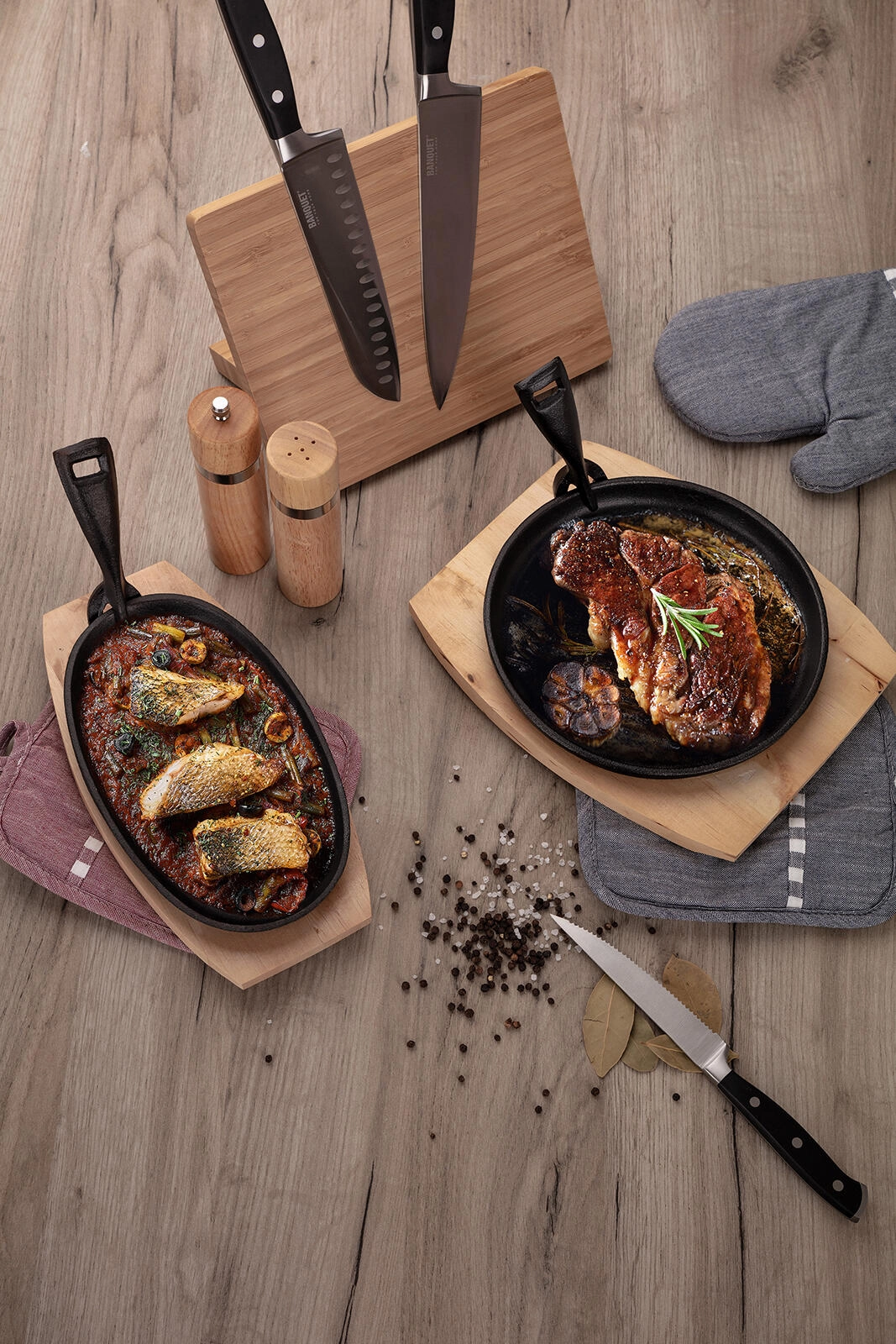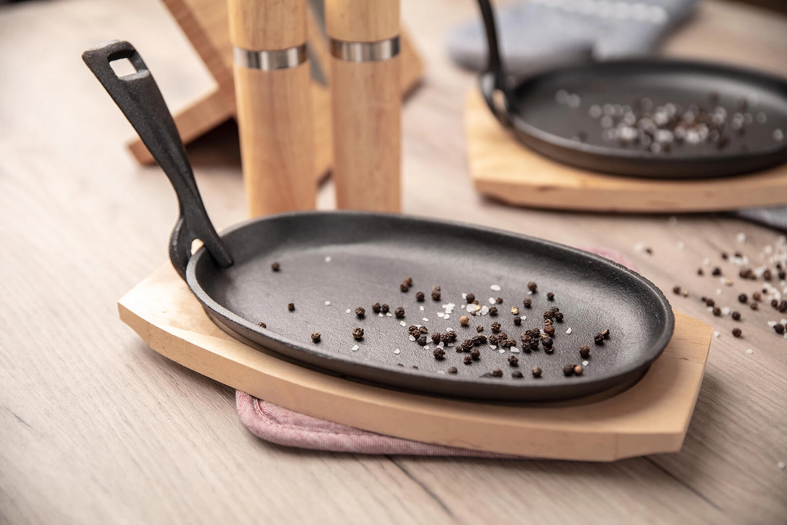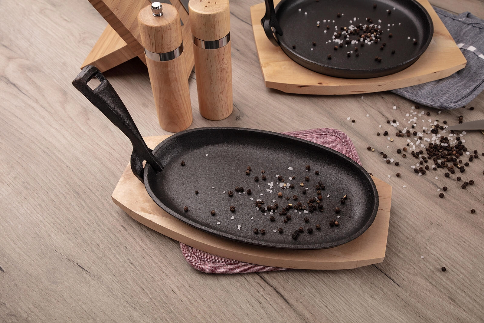 Liatinová panvica drží teplo a s dreveným prkénkom ju bezpečne prenesiete na stôl – jedlo zostane horúce a lákavo syčiace.