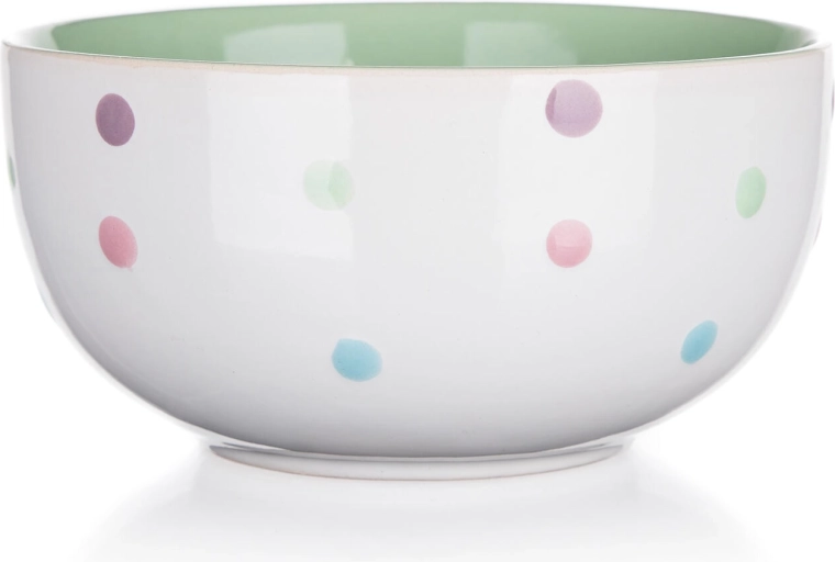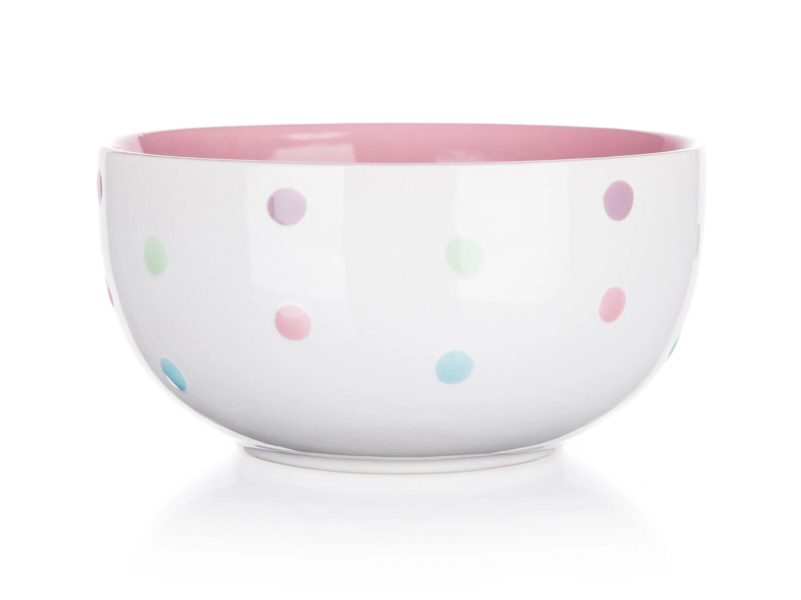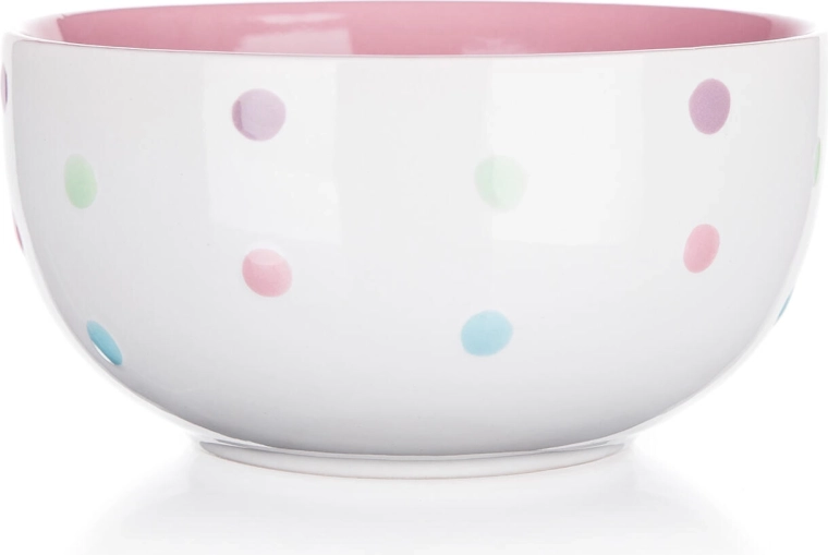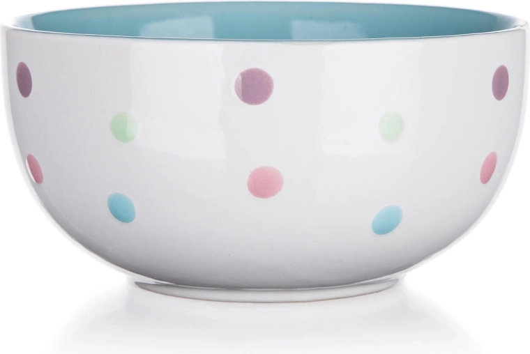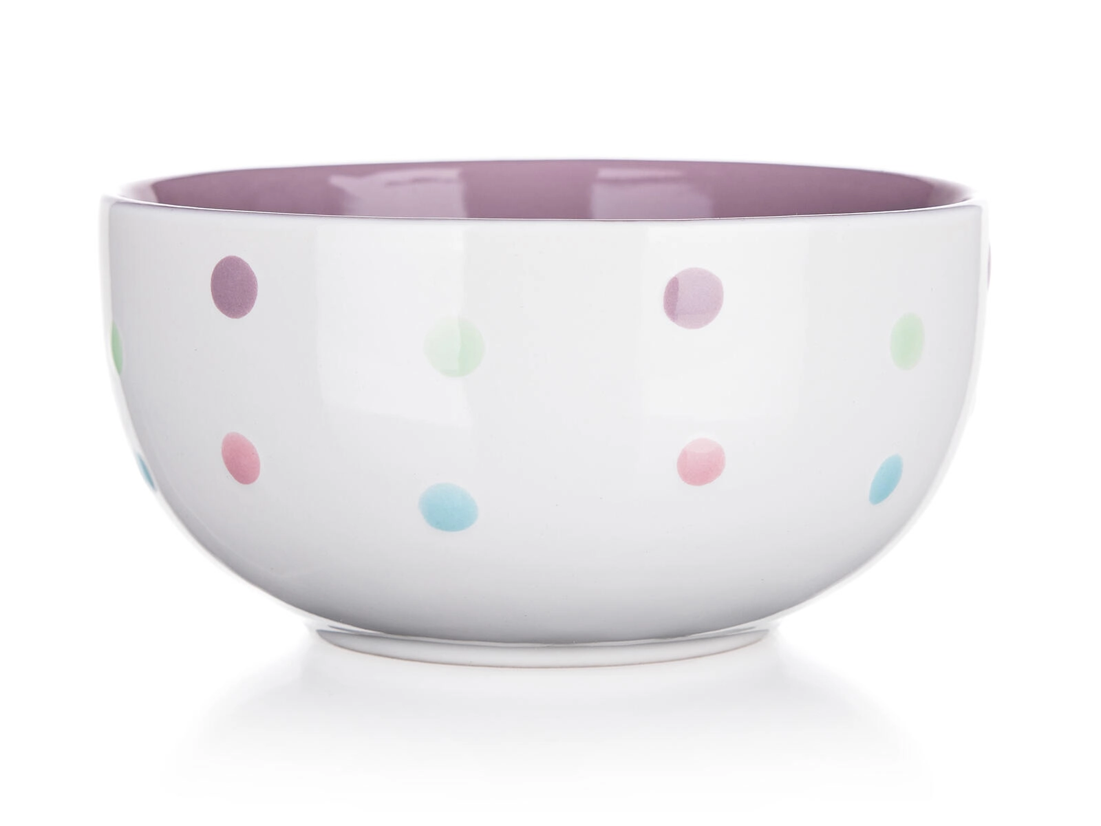 Táto praktická miska s objemom 520 ml vyniká bielym základom s pastelovými bodkami a farebným vnútrajškom (ružová, fialová, modrá, zelená). Vďaka kvalitnej keramike je vhodná na podávanie horúcich aj studených pokrmov a jej hladká glazúra sa ľahko udržiava.