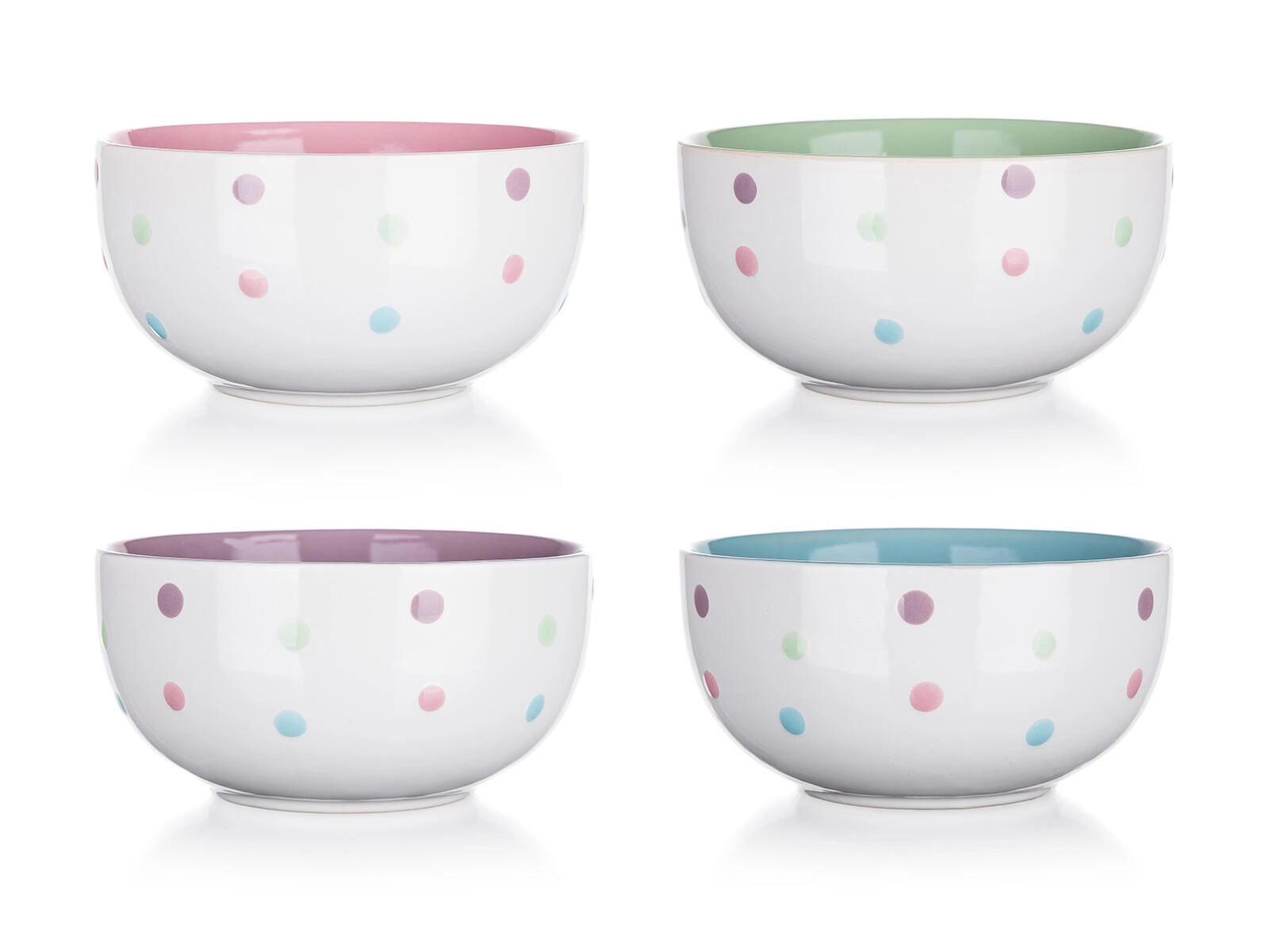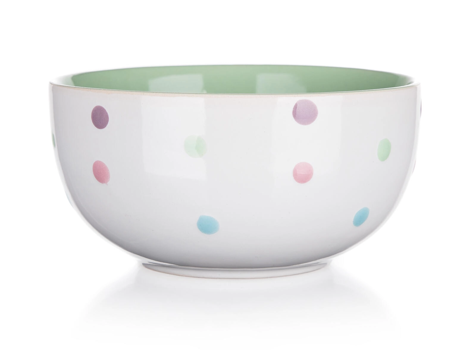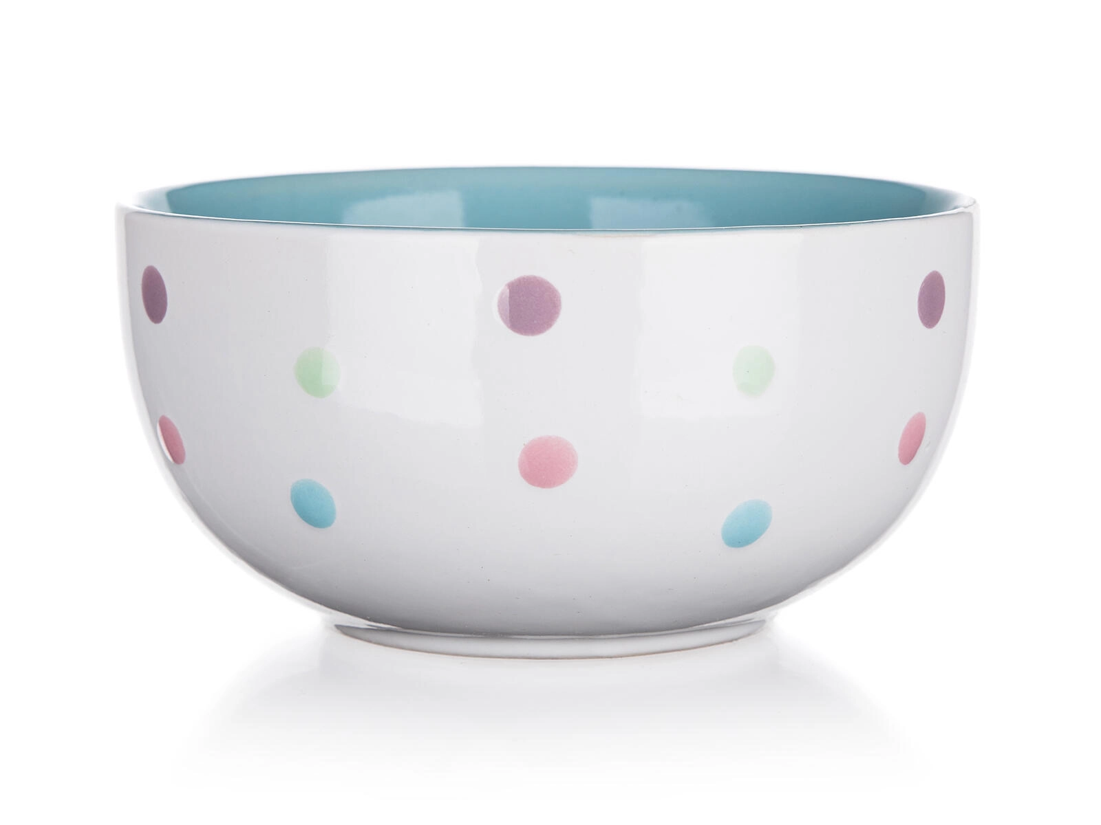 Táto praktická miska s objemom 520 ml vyniká bielym základom s pastelovými bodkami a farebným vnútrajškom (ružová, fialová, modrá, zelená). Vďaka kvalitnej keramike je vhodná na podávanie horúcich aj studených pokrmov a jej hladká glazúra sa ľahko udržiava.