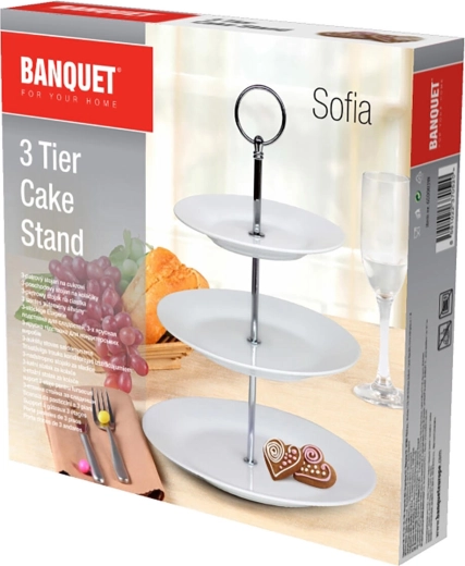 Tento trojposchodový okrúhly podnos Sofia dodá vášmu stolovaniu punc elegancie. Porcelánové taniere v čisto bielej farbe vyniknú v modernom aj klasickom interiéri a krásne zvýraznia servírované dobroty. Je skvelý na cukrovinky, makrónky, zákusky aj ovocie.