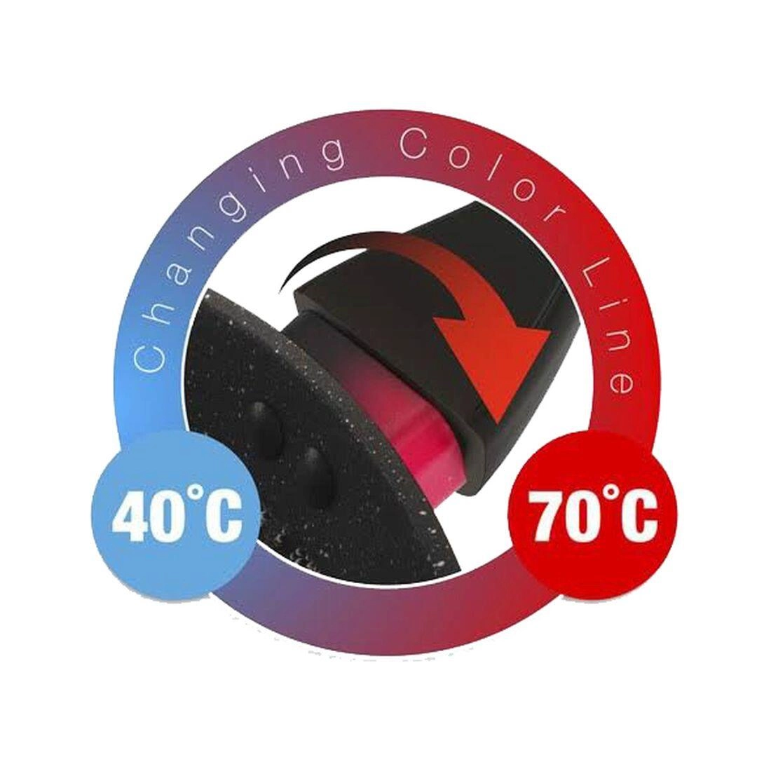Unikátny teplotný prstenec nad rukoväťou sa postupne sfarbuje z čiernej do sýto červenej od 40 °C do 70 °C, takže vždy viete, kedy je panvica pripravená na plné varenie. V balení nájdete aj ochrannú preložku v červenej farbe na bezpečné skladovanie bez poškriabania.
