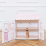 Luxusný trojposchodový dom v romantickom ružovo-bielom vyhotovení zaujme trblietavou vrúbkovanou strechou, srdiečkami a pestrými interiérovými dekoráciami v každej izbe. Otváracie okná a okenice pozývajú deti do sveta príbehov, zatiaľ čo stabilná drevená konštrukcia zaručuje dlhú životnosť. Domček sa dodáva bez vybavenia, takže si ho deti môžu dotvoriť nábytkom a figúrkami podľa svojho štýlu.