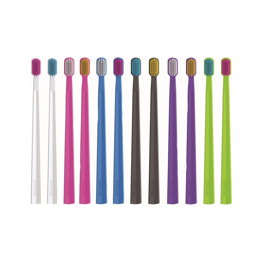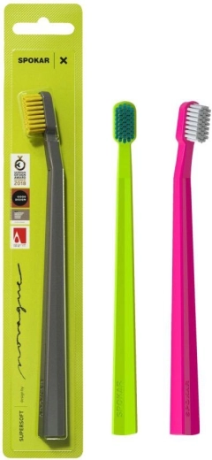 Zubná kefka Spokar X Supersoft je navrhnutá tak, aby spĺňala nároky citlivých zubov a ďasien. Jej unikátny dizajn vychádza z aktuálnych poznatkov stomatológov a prináša optimálny úchop pre presné vedenie a kontrolu pri čistení. Veľmi husto osadená hlavica s jemnými, zaoblenými vláknami šetrne kĺže po zuboch a efektívne narúša a odstraňuje zubný povlak.