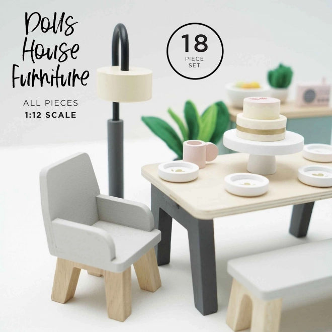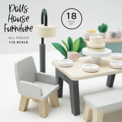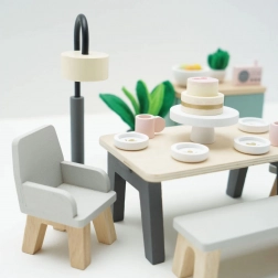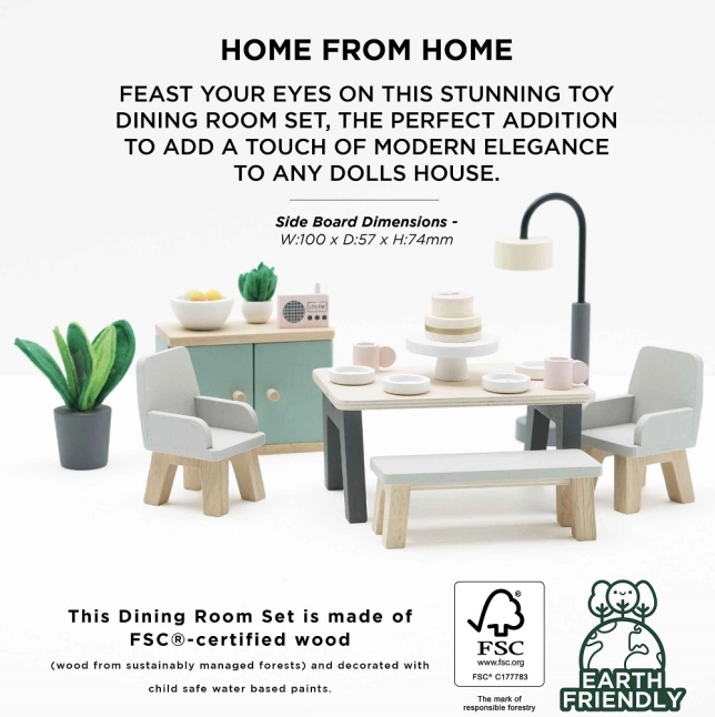 Tento pôvabný jedálenský set je vyrobený z kvalitného FSC certifikovaného dreva a prináša do každého domčeka pre bábiky dotyk sofistikovanosti. Obsahuje 18 prvkov, vrátane stola, dvoch kresiel, lavice, lampy, príborníka a dekoratívnych doplnkov ako sú rastliny, miska s ovocím a torta. Tento set nielenže vyzerá krásne, ale tiež podporuje poznávacie a komunikačné schopnosti detí. Je dekorovaný pomocou netoxických farieb na vodnej báze a je kompatibilný s ďalšími domčekmi Le Toy Van Dolls.