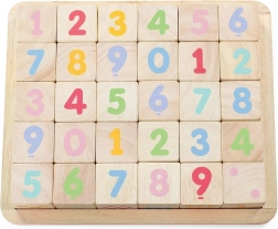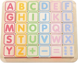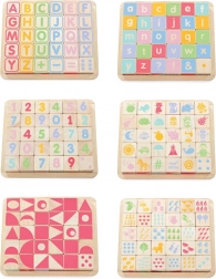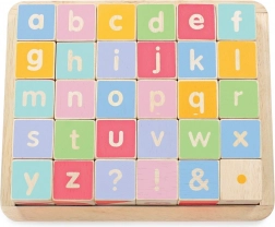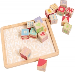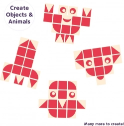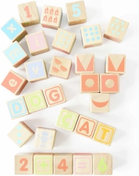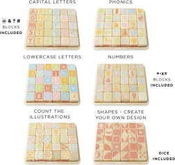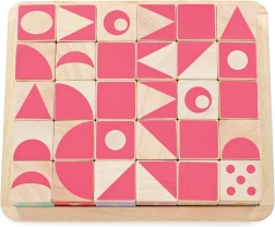 Zaoblené hrany kociek aj úložnej dosky zabezpečujú komfortnú a bezpečnú manipuláciu. Hračka je bez obsahu plastu, vyrobená z FSC certifikovaného dreva s dôrazom na etickú výrobu a udržateľnosť. Sada podporuje rozvoj kognitívnych zručností, priestorovej predstavivosti a jazykových schopností.