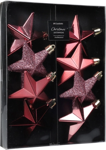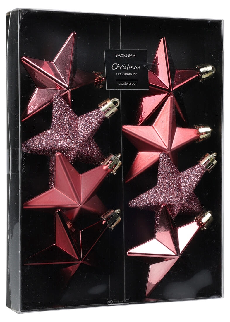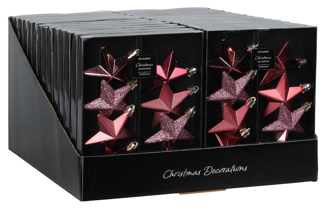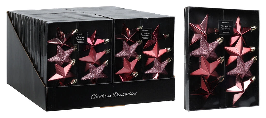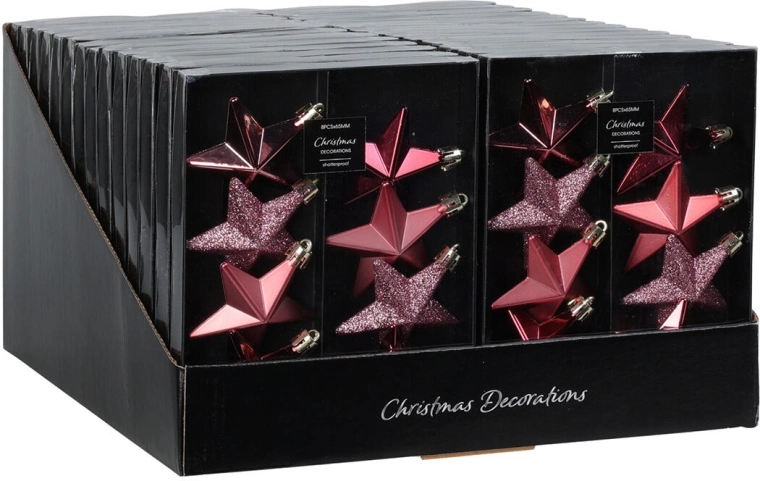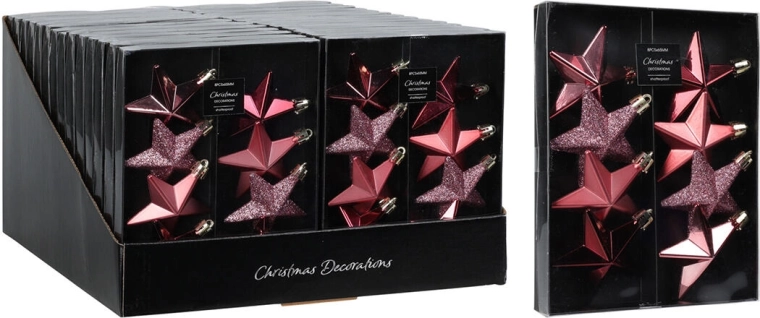 Elegantná vianočná sada obsahuje závesné ozdoby v tvare hviezdy s priemerom 6,5 cm v ružových odtieňoch. Perfektné na stromček, vence aj sviatočné dekorácie, dodajú interiéru jemný trbliet a sviatočnú atmosféru.