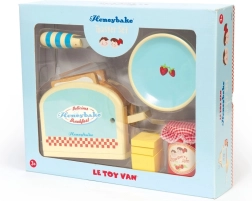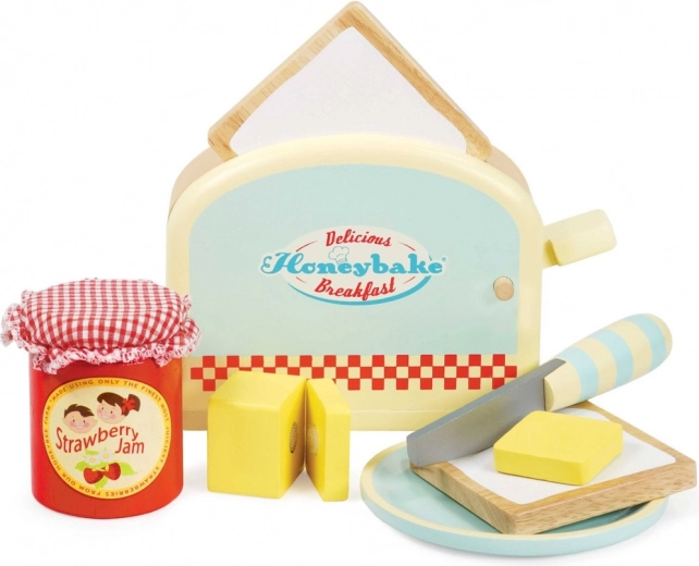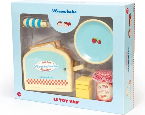 Doprajte deťom kúzelné ranné rituály s drevenou súpravou LE TOY VAN Honeybake. Štýlový hriankovač s pružinou, plátky chleba, maslo na suchý zips, džem, nôž a tanierik podporuje predstavivú hru, jemnú motoriku aj sociálne zručnosti. Vyrobené z udržateľného dreva a maľované netoxickými farbami.