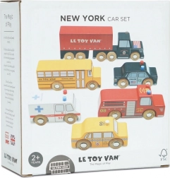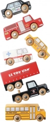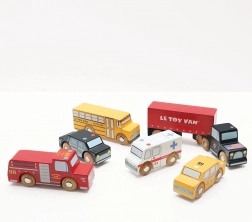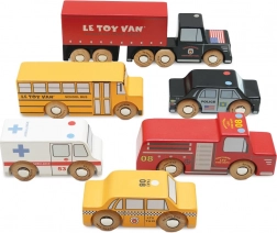 Školský autobus, hasičské auto, sanitka, policajné auto, taxík a kĺbový nákladiak tvoria pestrú sadu, ktorá inšpiruje k príbehom z rušných ulíc mesta.