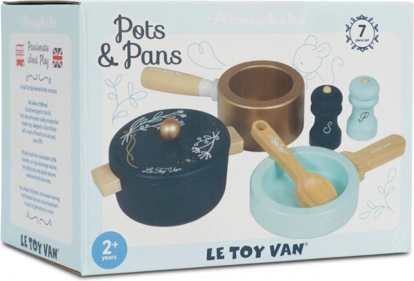 Štýlová drevená sada riadu pre malých kuchárov od 2 rokov. Obsahuje hrniec s pokrievkou, rajnica, panvička, vareška, soľnička a korenička. Vyrobené z FSC dreva, ručne maľované netoxickými farbami na vodnej báze a navrhnuté tak, aby podporovalo predstavivosť a jemnú motoriku pri bezpečnej hre.