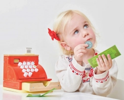 Červená drevená pokladňa LE TOY VAN z oceňovanej kolekcie Honeybake kombinuje kvalitné spracovanie, bezpečné materiály a očarujúci vintage vzhľad so zlatými detailmi. Je ideálna na hru na obchod a rozvoj sociálnych zručností, kreativity a základných matematických schopností.