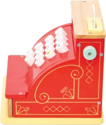 Veselá červená farba so zlatými prvkami a veľké tlačidlá robia z pokladne atraktívny kúsok do každého detského obchodíka.