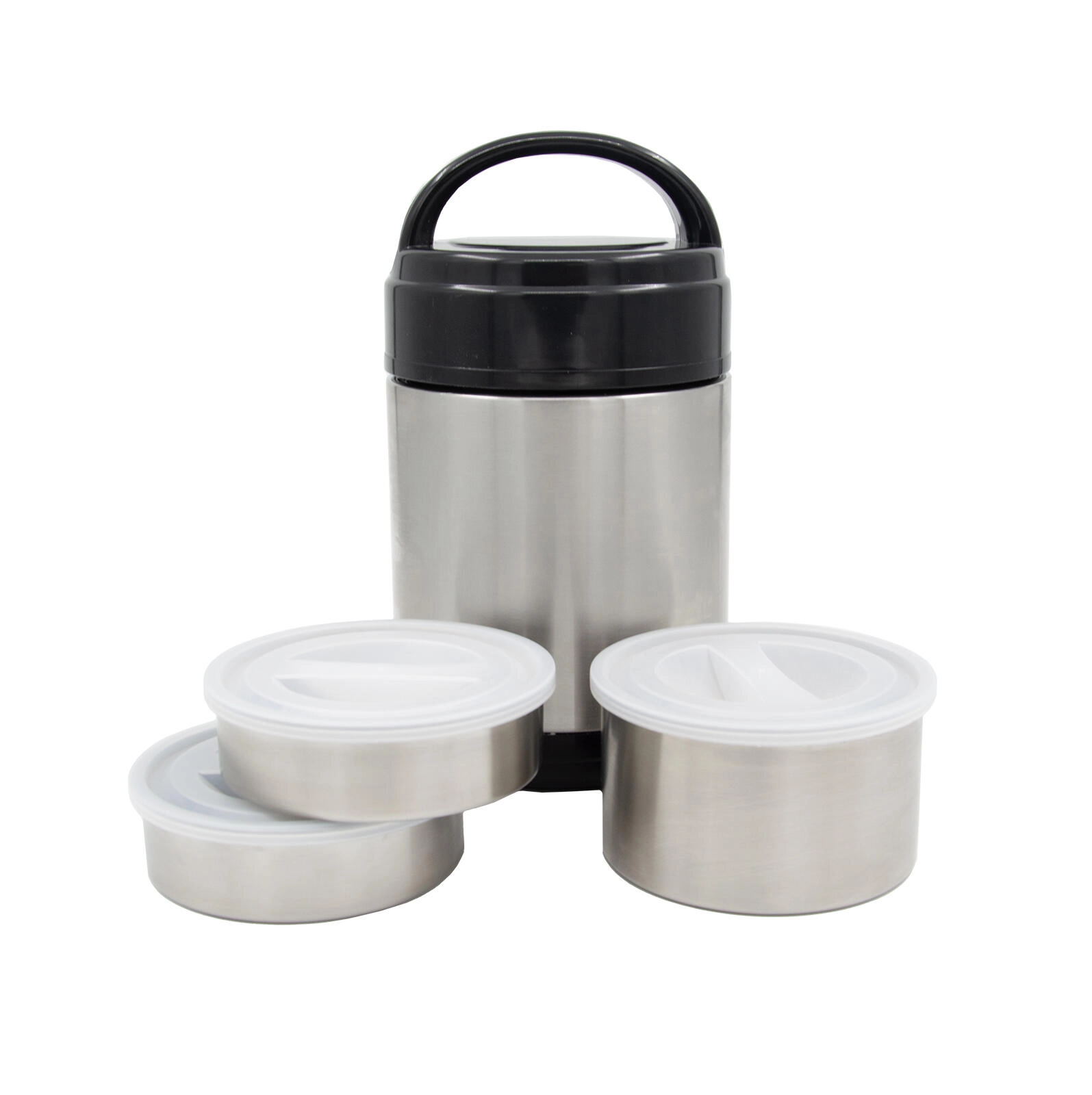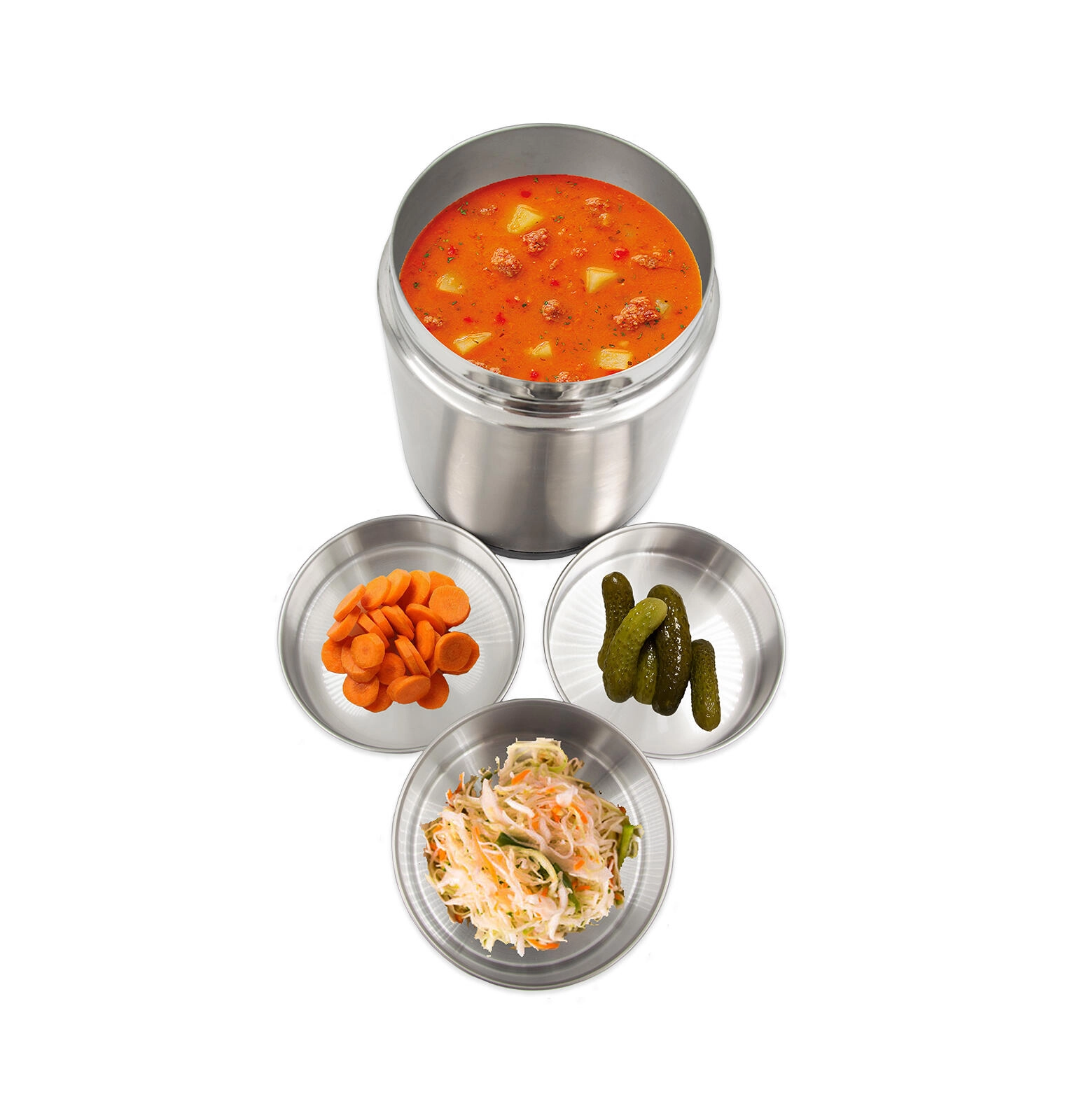 Termoska na jedlo s priemerom 11 cm kombinuje odolnú nehrdzavejúcu oceľ s praktickými plastovými prvkami. Vo vnútri nájdete tri samostatné misky – dve s objemom 0,25 l a jednu 0,5 l – každá s plastovým tesniacim viečkom. To umožňuje bezpečne oddeliť rôzne chody, udržať čerstvosť a pohodlne servírovať. Vonkajšie plastové dno znižuje hlučnosť pri pokladaní a robustná rukoväť uľahčuje prenášanie.