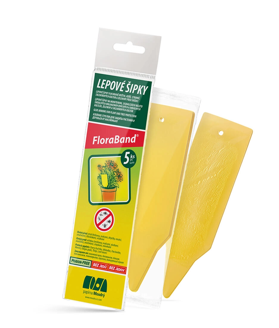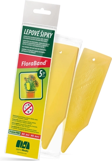 Praktické lepové šípky Flora Band účinne chránia izbové aj záhradné rastliny pred škodcami. Vďaka výraznej žltej farbe škodcov spoľahlivo priťahujú a lepiaca plocha ich rýchlo zachytí. Balenie obsahuje 5 ks šípok – 3 obojstranne lepiace a 2 jednostranne lepiace – pre jednoduché umiestnenie priamo do substrátu.