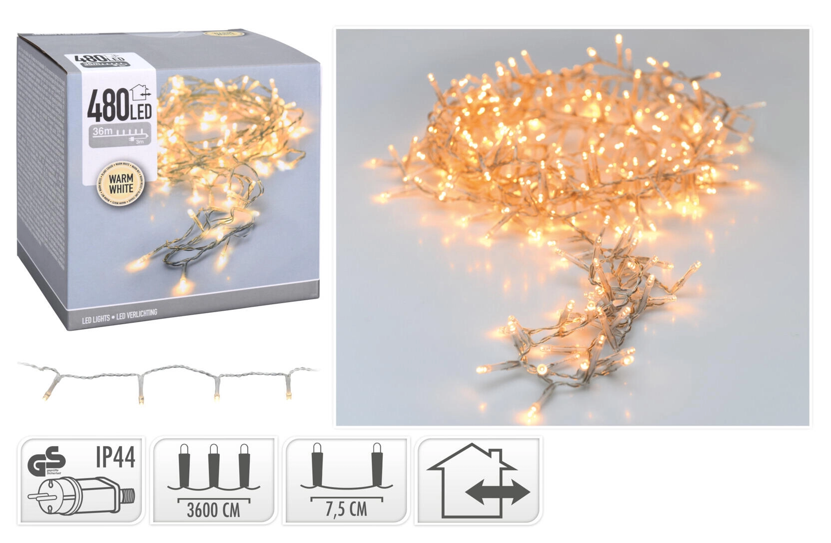 Reťaz je určený na priame zapojenie do zásuvky a svojím krytím IP44 odolá bežným poveternostným podmienkam. Dĺžka 36 m s 480 LED diódami zabezpečí rovnomerné nasvietenie väčších plôch bez zložitej inštalácie.