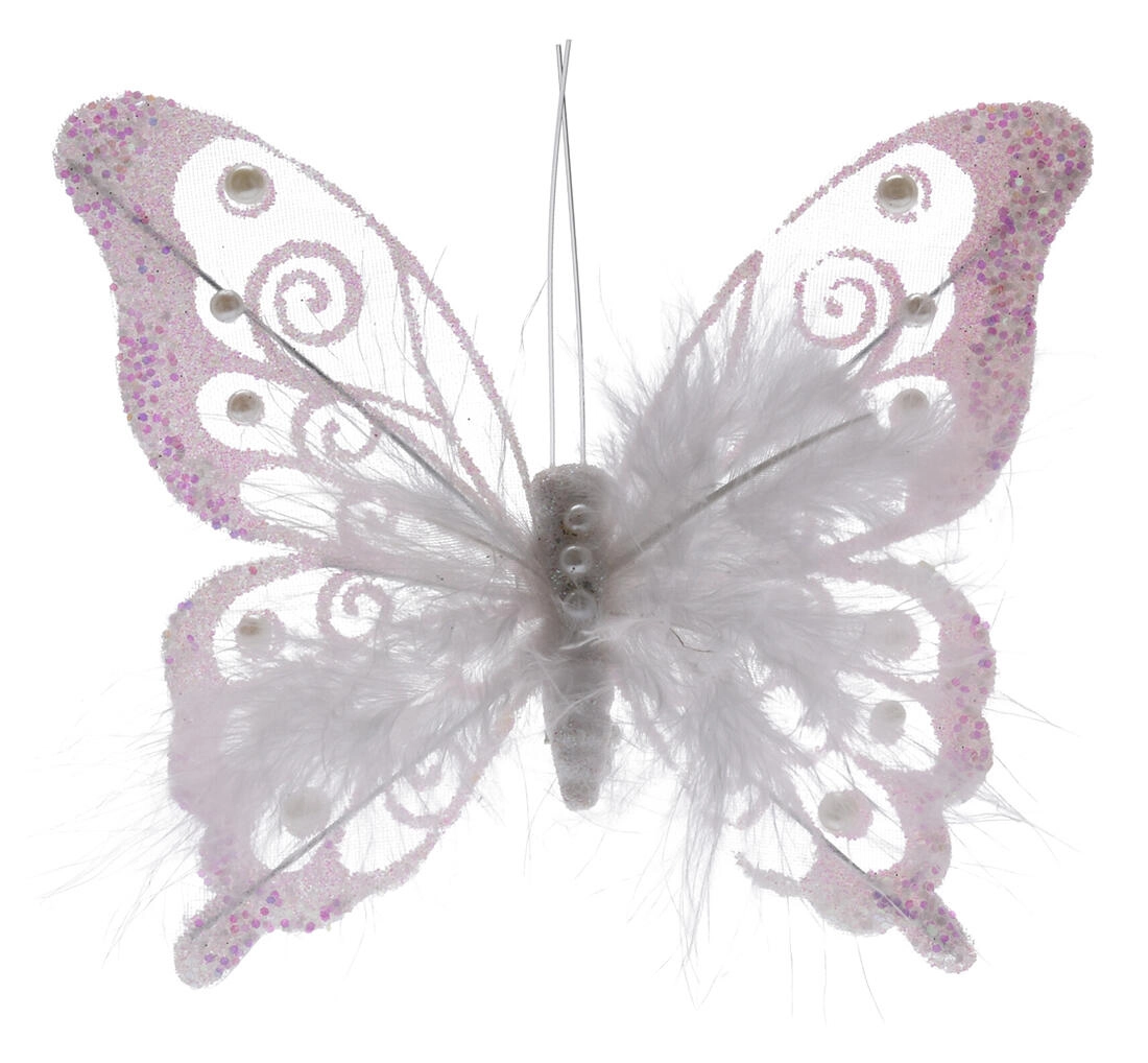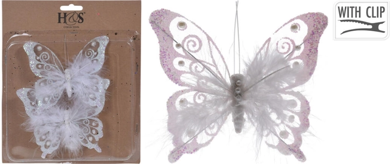 Elegantné dekoračné motýle v bielej farbe s jemnými pierkami a trblietkami dodajú vášmu domovu čarovný nádych. Vďaka praktickej klipse ich ľahko pripevníte na vetvičky, závesy či vence. Ideálne ako celoročná dekorácia aj vianočná ozdoba na stromček. Balenie obsahuje 2 kusy.
