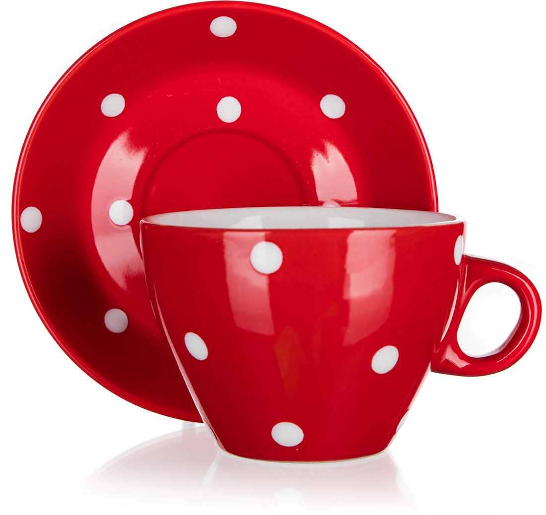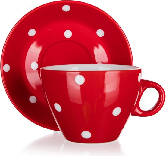 Štýlový keramický šálka s podšálkou s objemom 290 ml v červenej farbe s bielymi bodkami dodá vášmu stolovaniu hravý nádych. Je vyrobený z kvalitnej keramiky, je vhodný do mikrovlnnej rúry a možno umývať v umývačke, takže je ideálny na každodenné použitie.