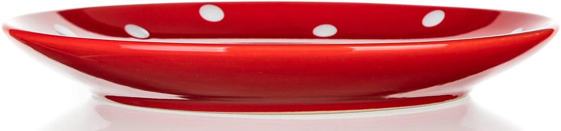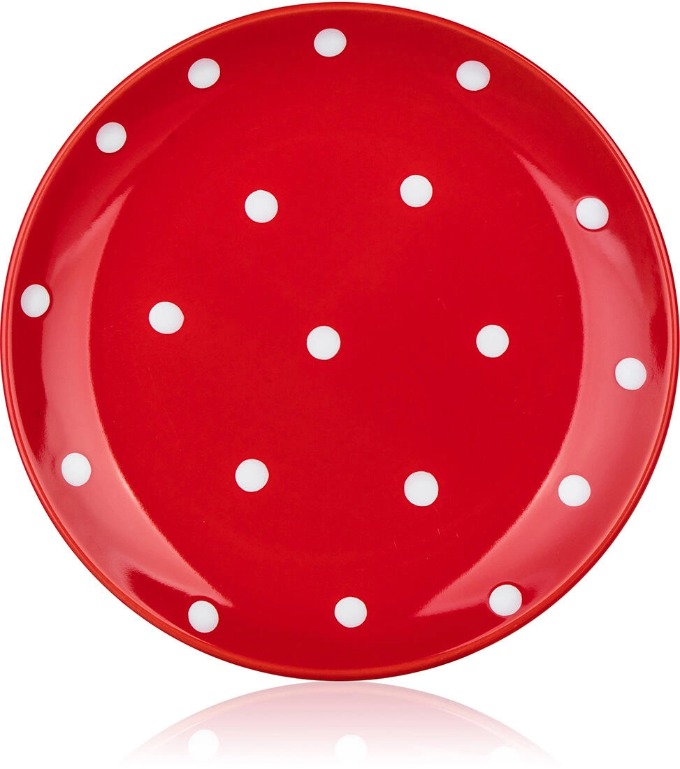 Štýlový dezertný tanier s priemerom 18,6 cm v červenej farbe s bielymi bodkami dodá stolovaniu hravý šmrnc. Vyrobený z kvalitnej keramiky, je vhodný na každodenné používanie, možno umývať v umývačke a ohrievať v mikrovlnnej rúre. Ideálny na dezerty, desiaty aj malé občerstvenie.