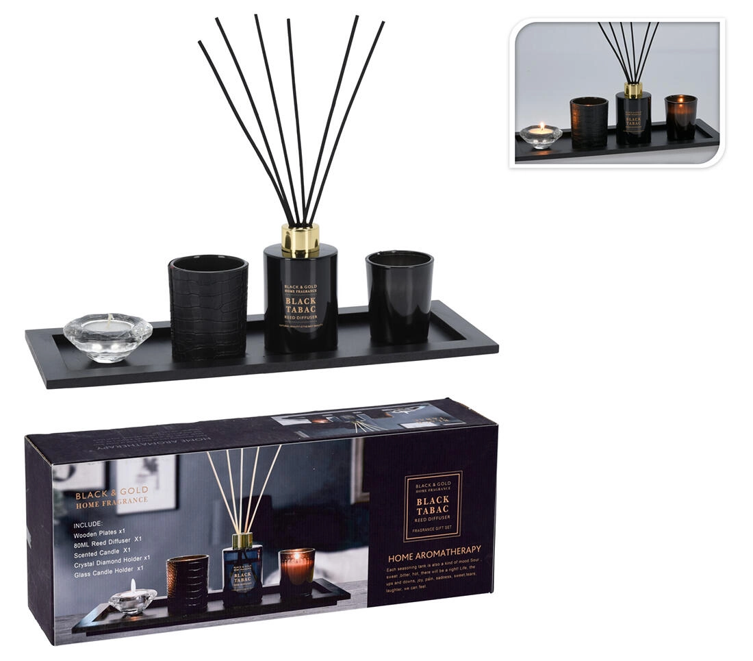- Kompletná výbava: difuzér, sviečka v skle, 2× sklenený svietnik, drevený podnos
